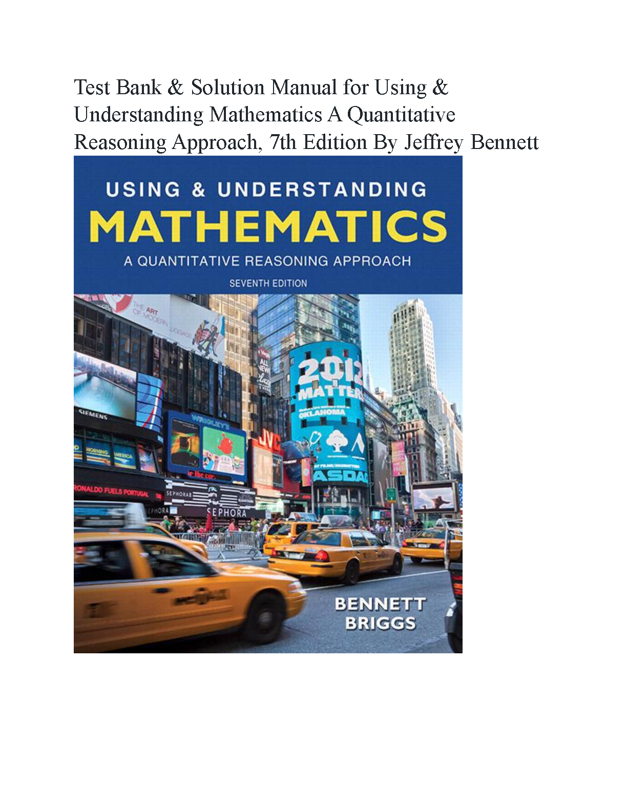 This is the Test Bank & Solution Manual for the 7th Edition of the textbook 'Using & Understanding Mathematics: A Quantitative Reasoning Approach' by Jeffrey Bennett & William Briggs. It's a valuable resource for educators and students using this textbook, providing answers to all exercises and problems. This manual offers support for effective teaching and learning of mathematics, making sure students grasp key concepts.