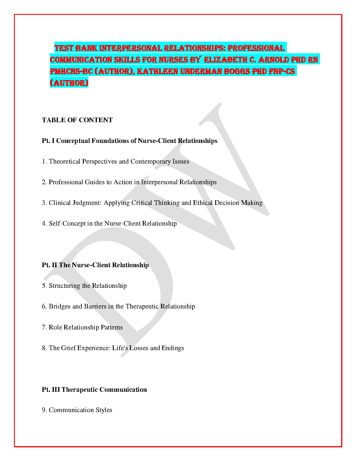 This test bank is a valuable resource for nursing students who are preparing for their exams. The test bank contains hundreds of practice questions that cover a variety of topics related to interpersonal relationships and communication skills. The test bank questions are aligned with the most recent edition of the Interpersonal Relationships textbook.