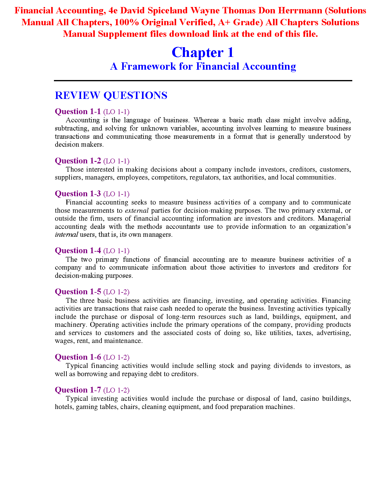 Financial Accounting, 4e - David Spiceland, Wayne Thomas, Don Herrmann - A Framework for Financial Accounting (Solutions Manual All Chapters, 100% Original Verified, A+ Grade)