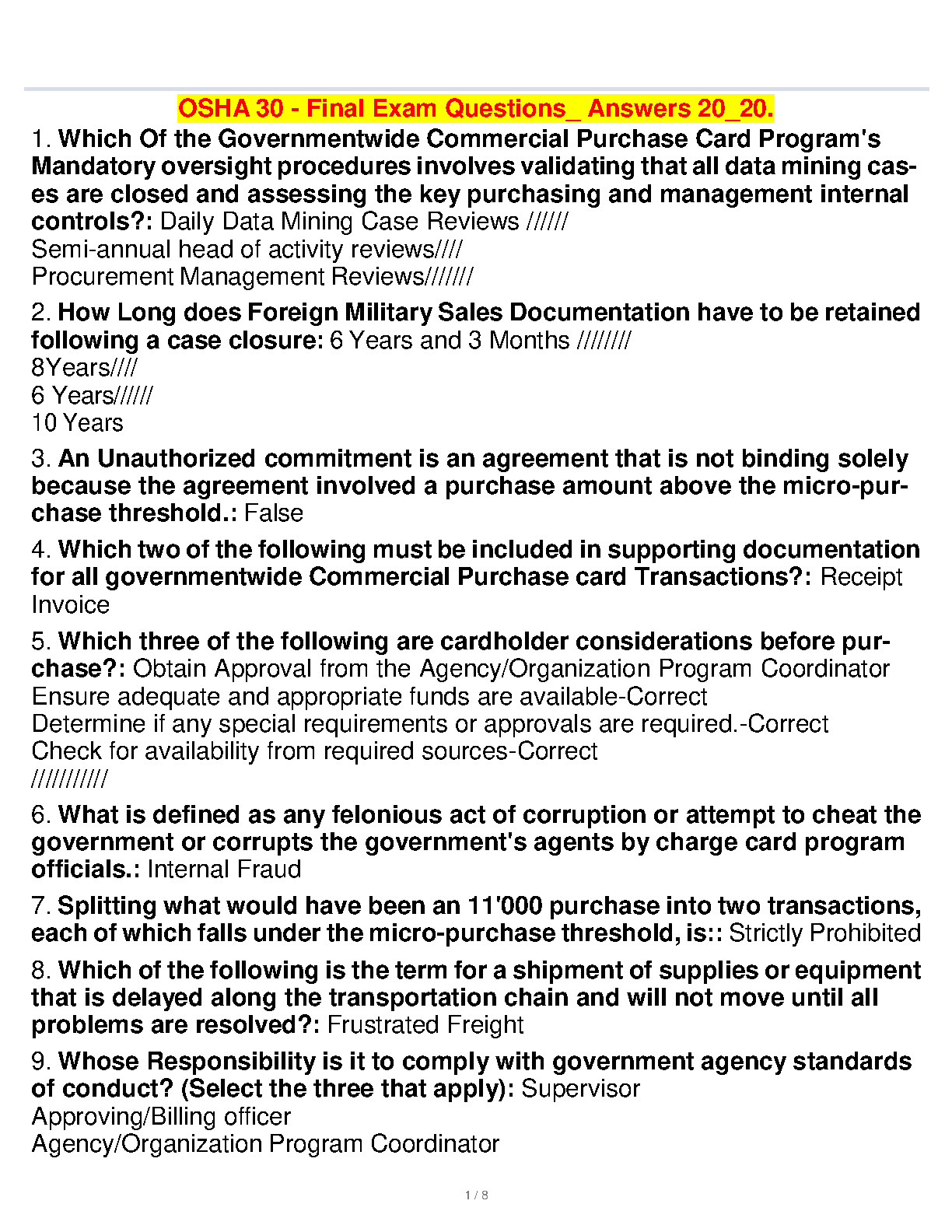 This comprehensive OSHA 30 Final Exam study guide provides 2024/2025 questions and answers to help students prepare for their exam and ace it on the first attempt, avoiding any resits. This resource is designed for students who are preparing for the OSHA 30 certification exam.