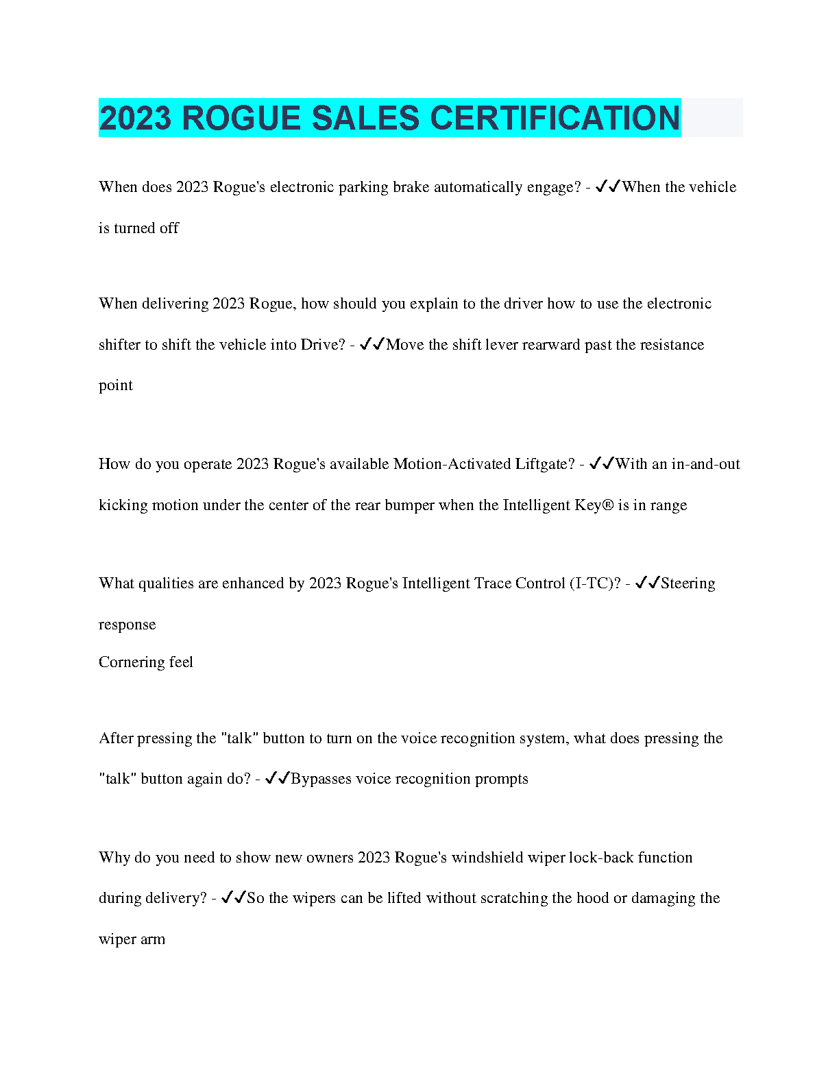 Prepare for your 2023 Rogue Sales Certification exam with confidence! Our comprehensive study guide provides detailed information on the latest vehicle features and specifications, equipping you to confidently answer questions and pass your exam.