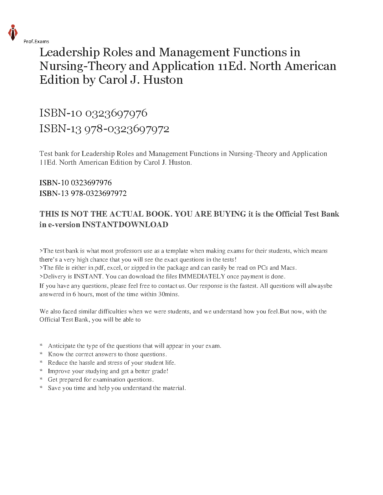Ace your nursing management exams with this comprehensive test bank for Leadership Roles and Management Functions in Nursing: Theory and Application, 11th Edition by Carol J. Huston. This invaluable resource provides you with practice questions covering all the key concepts and topics from the textbook, helping you master the material and feel confident on exam day.