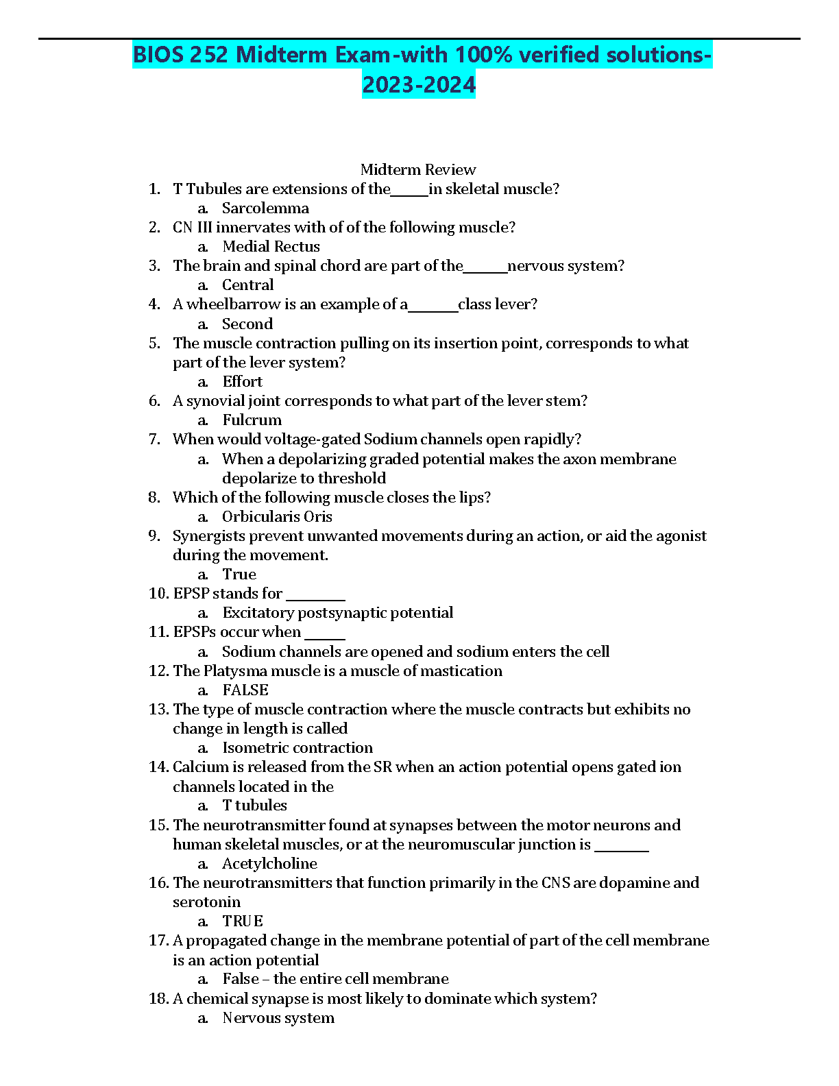 This comprehensive study guide provides detailed solutions to all the questions in the BIOS 252 midterm exam, ensuring students understand the material and ace their exams. This resource is perfect for students who want to avoid resits and achieve their academic goals.