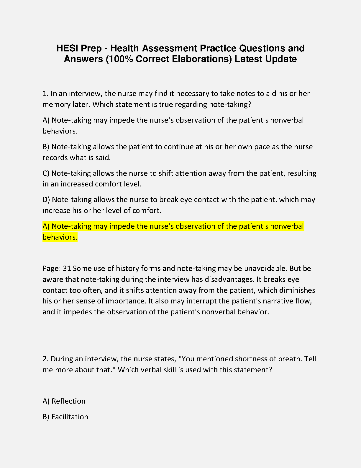 HESI Prep - Health Assessment Practice Questions and Answers (100% Correct Elaborations) Latest Update 2024/2025