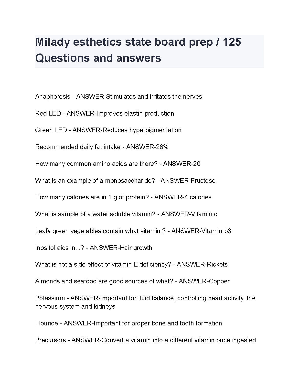 Ace your Milady Esthetics state board exam on the first try with this comprehensive study guide. This resource features 125 high-yield questions and answers designed to test your knowledge of essential esthetics concepts.