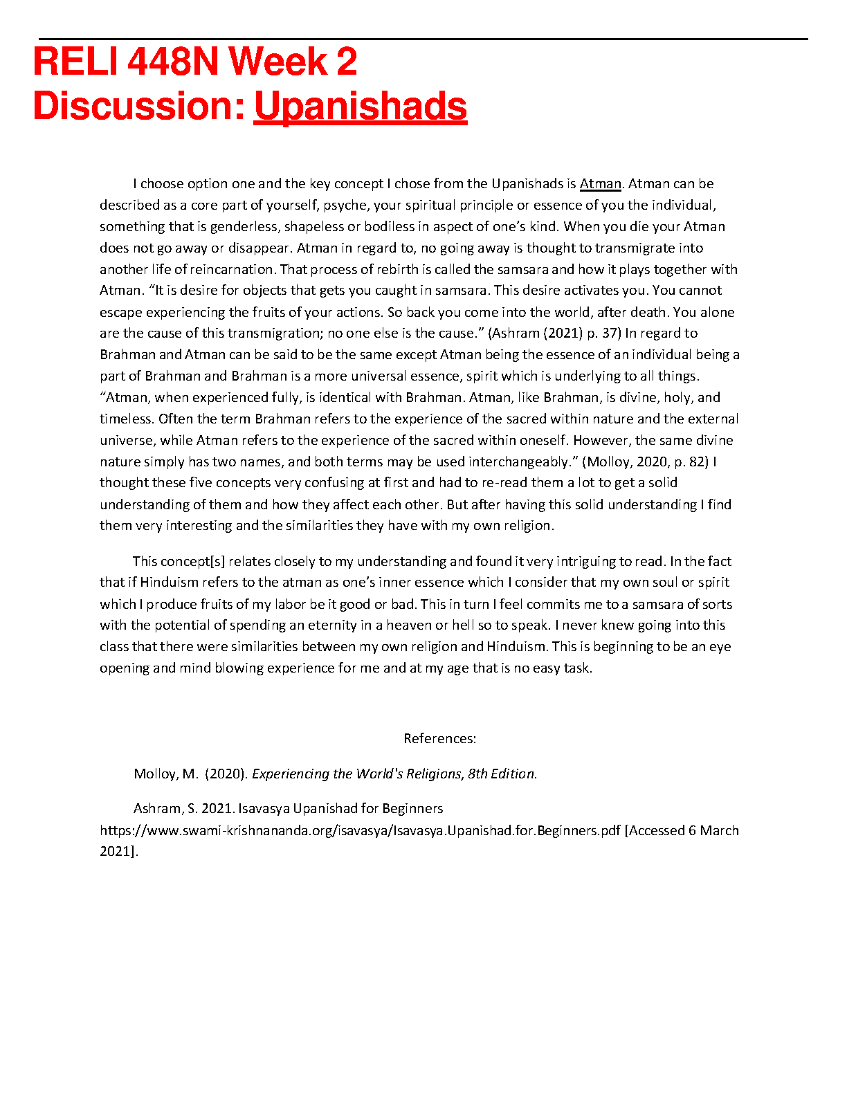 RELI 448N Week 2 Discussion: Upanishads by Molly, M. (2020) - Experiencing the World's Religions, 8th Edition