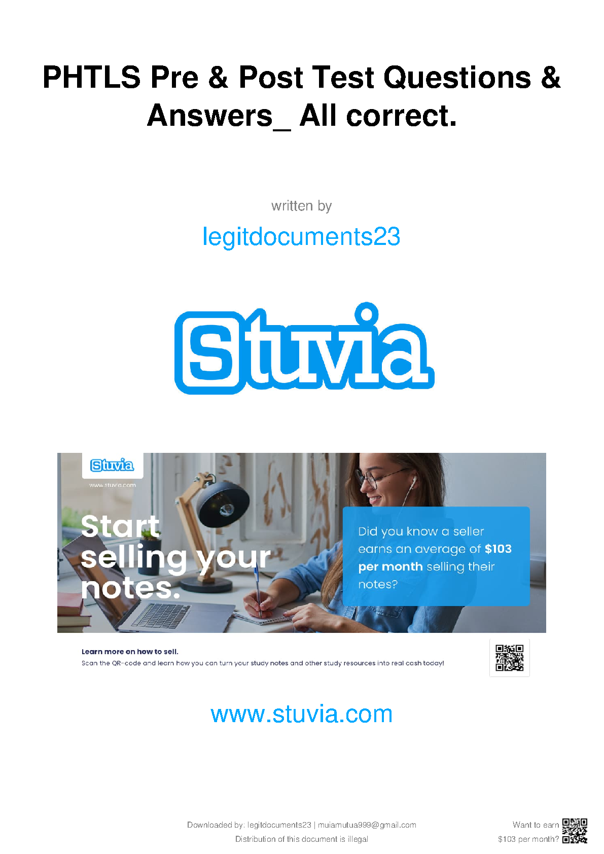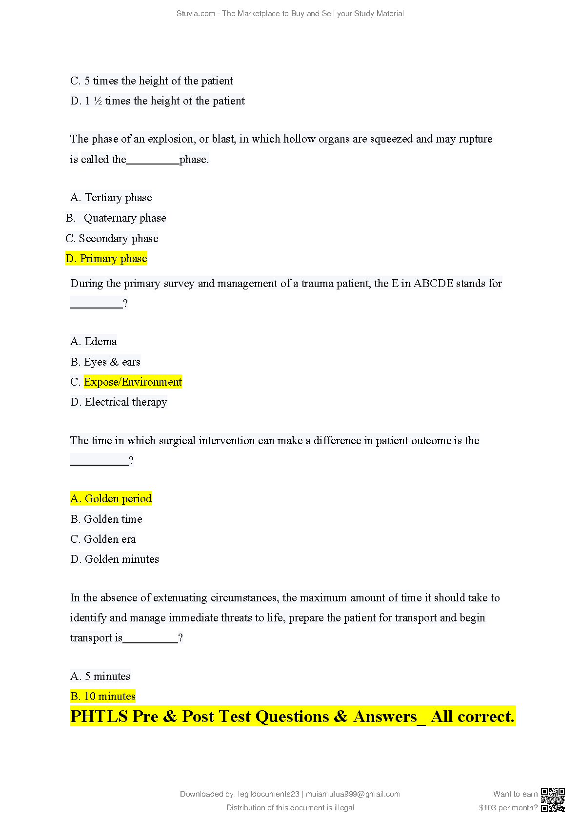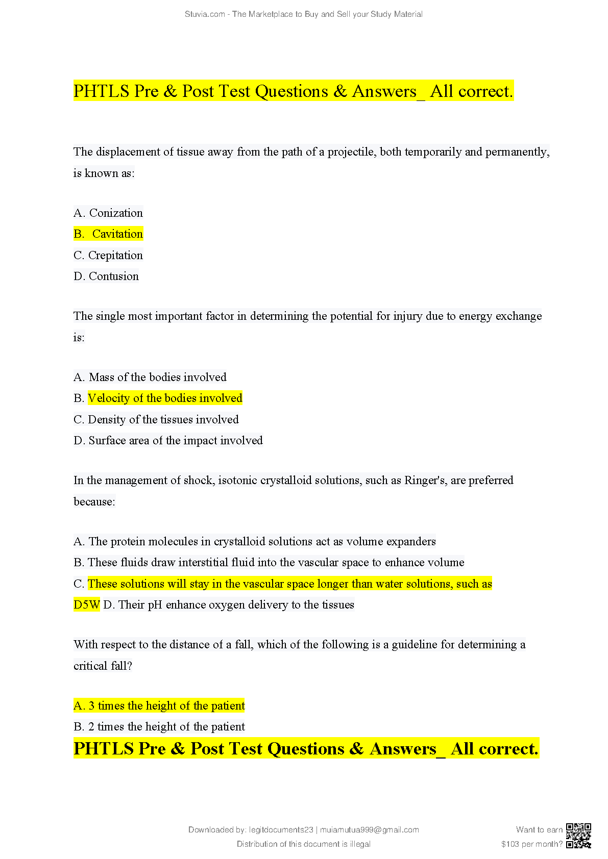 PHTLS Pre & Post Test Questions & Answers - All correct. 7th Edition - by American College of Surgeons, Committee on Trauma.