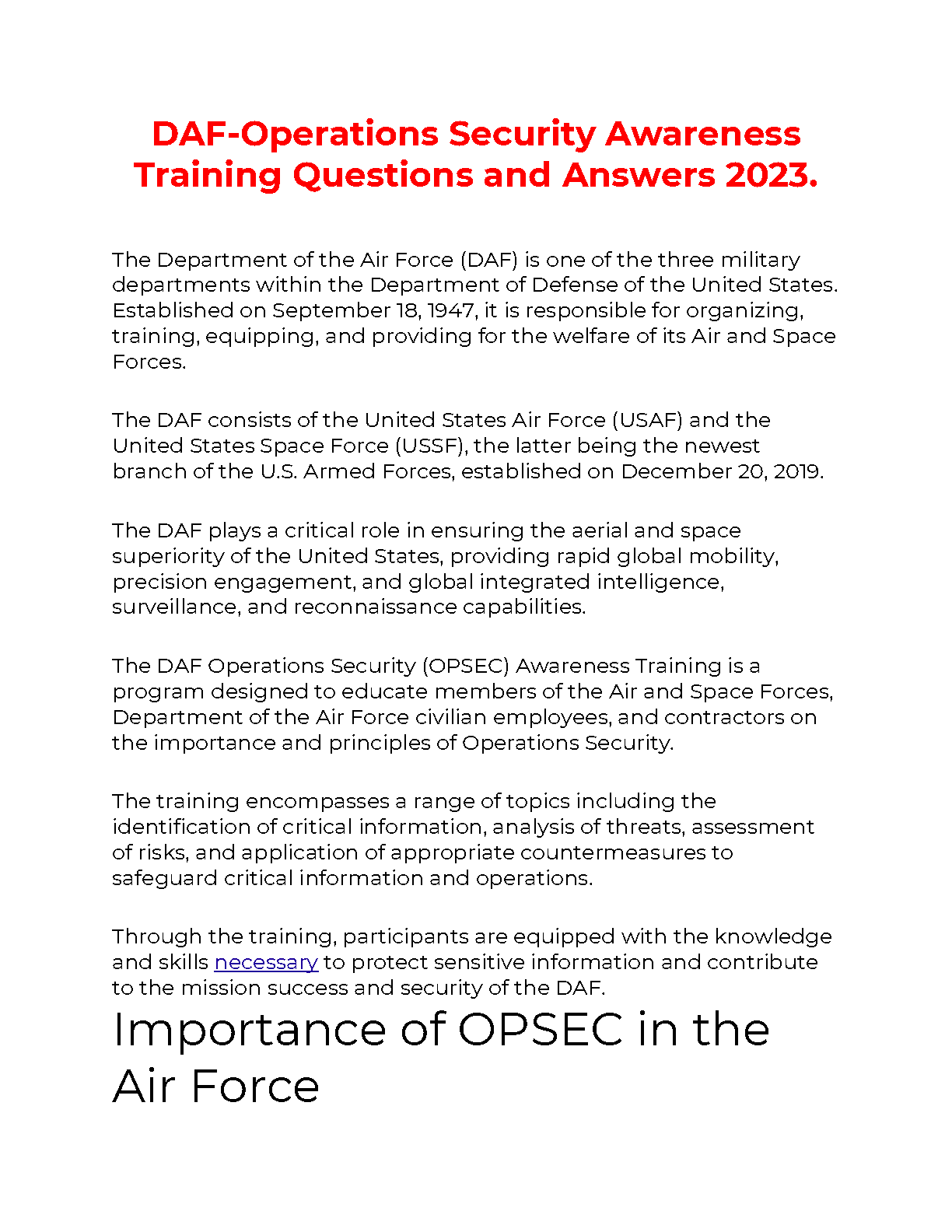 DAF-Operations Security Awareness Training Questions and Answers 2023: A Comprehensive Guide to Mastering OPSEC for the Air Force