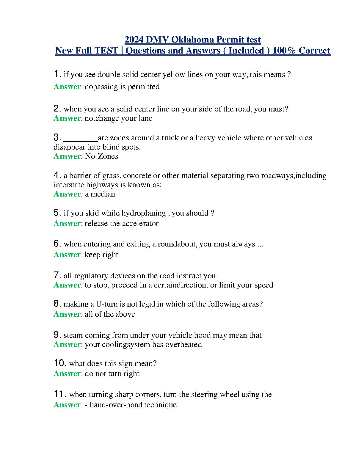 2024 DMV Oklahoma Permit Test: Questions and Answers (Included) 100% Correct - Latest Edition for First Time Passers