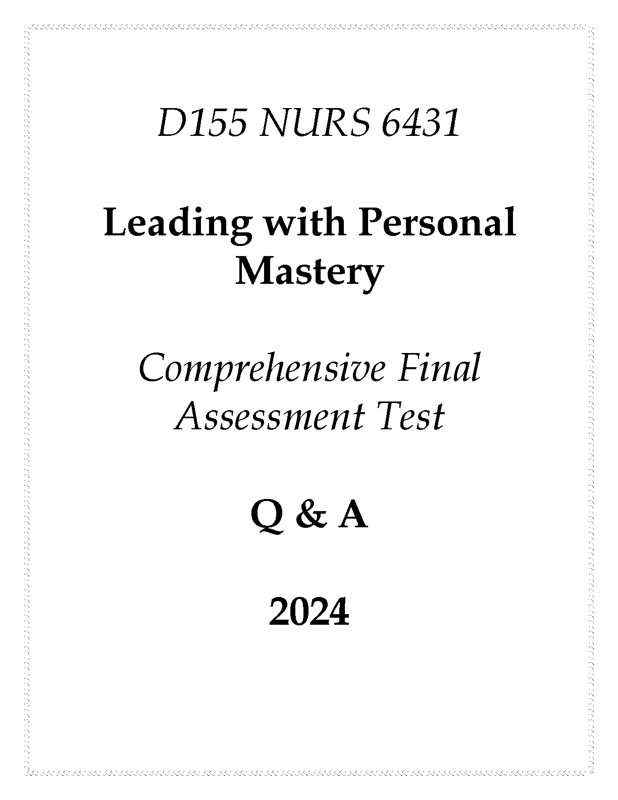 This comprehensive final assessment test, covering the D155 NURS 6431 course, 'Leading with Personal Mastery', is designed to help nursing students excel on their final exam, ensuring they avoid resits and pass with confidence.