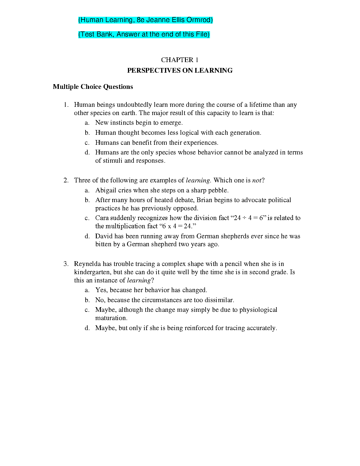 Comprehensive Test Bank for Human Learning 8th Edition by Jeanne Ellis Ormrod, providing thorough practice for your exams. Get ready to ace your course and avoid any resits with this essential resource.
