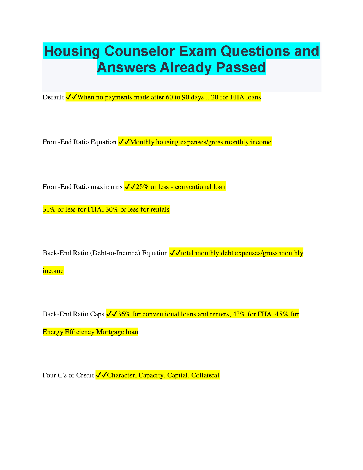 Ace your Housing Counselor Exam with confidence using our comprehensive study guide. This book provides a thorough overview of key housing counselor concepts, including front-end and back-end ratios, debt-to-income calculations, and the four C's of credit. Master the essential knowledge and prepare for your exam with this easy-to-understand resource.