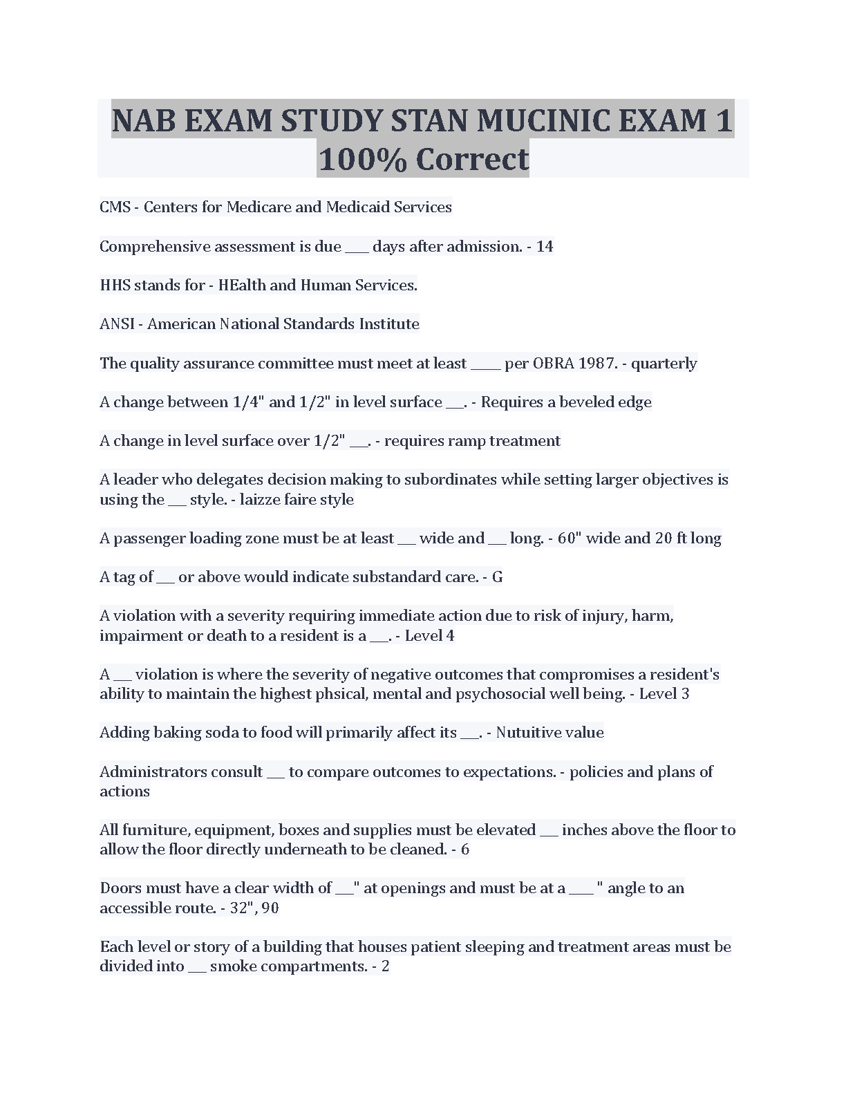 NAB EXAM STUDY STAN MUCINIC EXAM 1 100% Correct