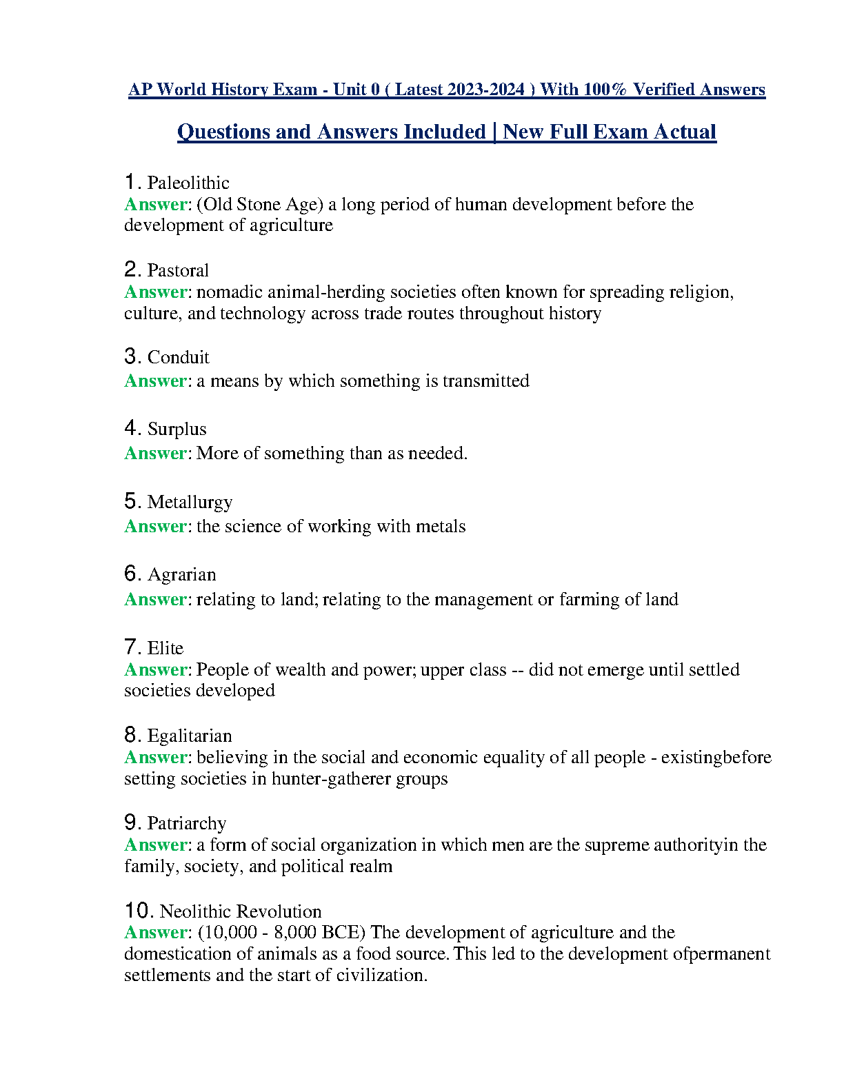 AP World History Exam - Unit 0 (Latest 2023-2024) With 100% Verified Answers - Questions and Answers Included | New Full Exam Actual