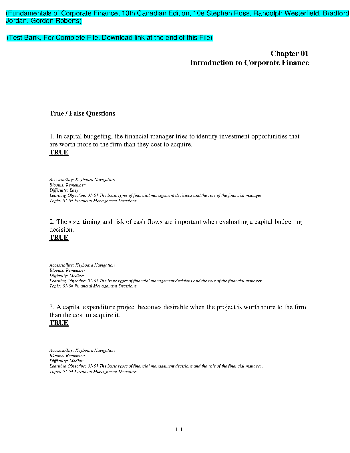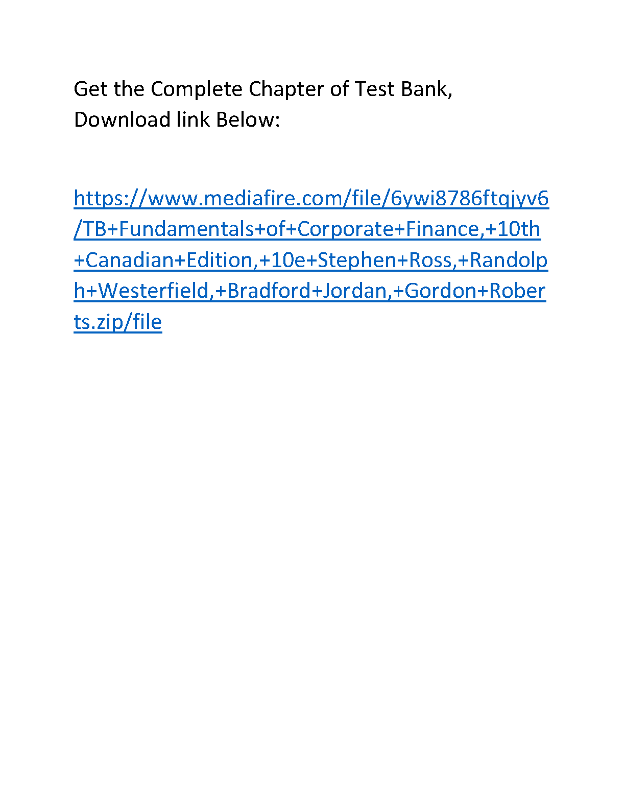 Fundamentals of Corporate Finance, 10th Canadian Edition Test Bank - Stephen Ross, Randolph Westerfield, Bradford Jordan, Gordon Roberts