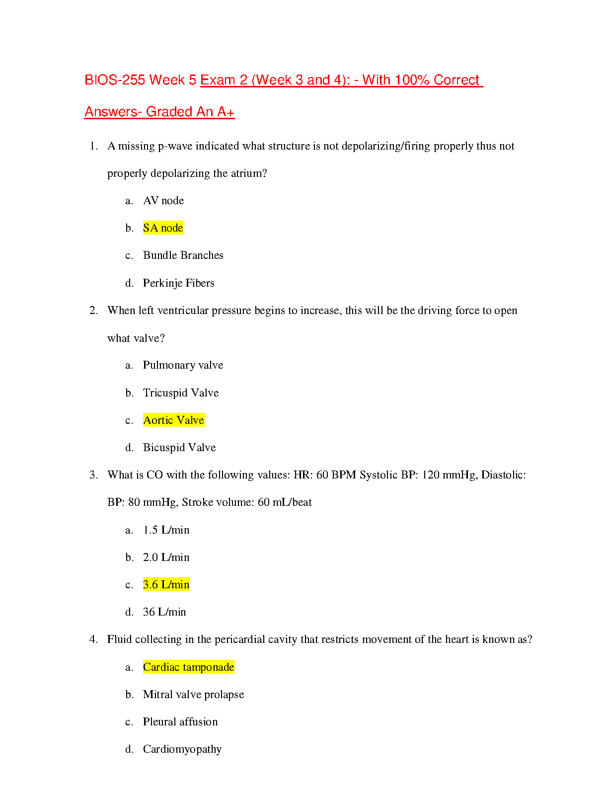 BIOS-255 Week 5 Exam 2 (Week 3 and 4): - With 100% Correct Answers- Graded An A