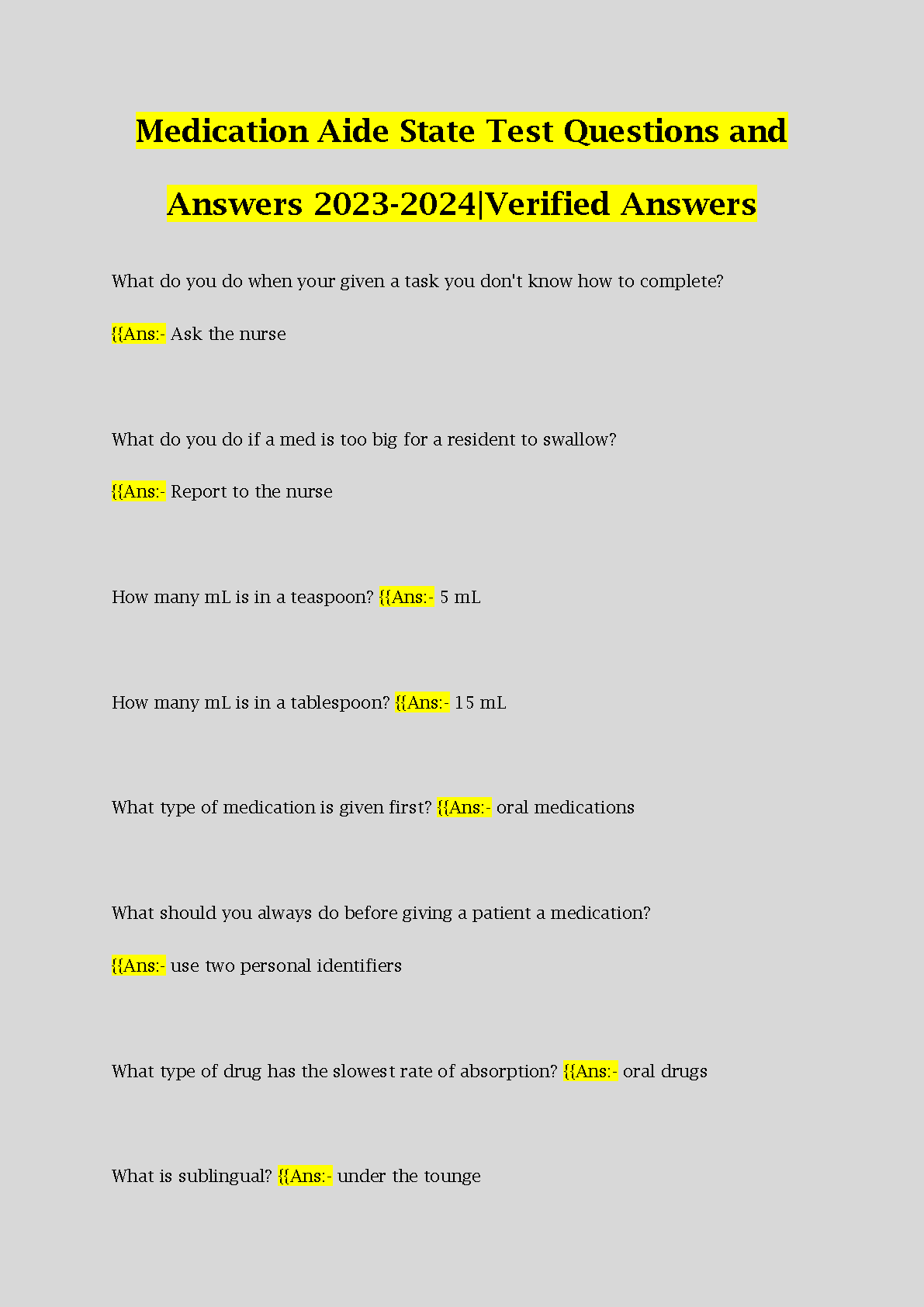 Medication Aide State Test Questions and Answers 2023-2024: Verified Answers for Success
