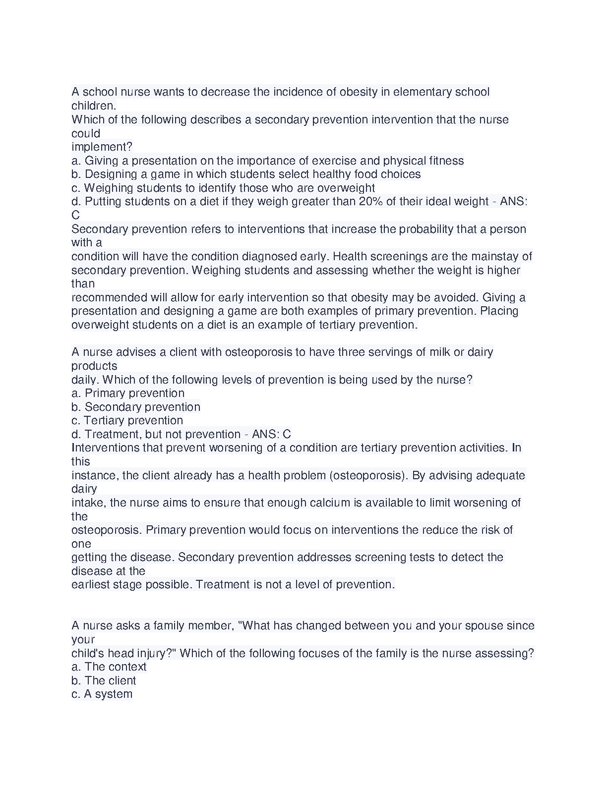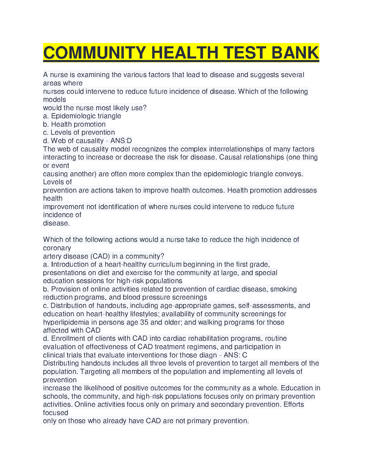 This Community Health Test Bank is your ultimate resource for mastering the concepts and skills needed to succeed in your nursing career. Our meticulously crafted questions and answers cover all the essential topics, including health promotion, disease prevention, epidemiology, and more. Prepare for your exams with confidence and enhance your knowledge base with our detailed explanations and insightful insights.