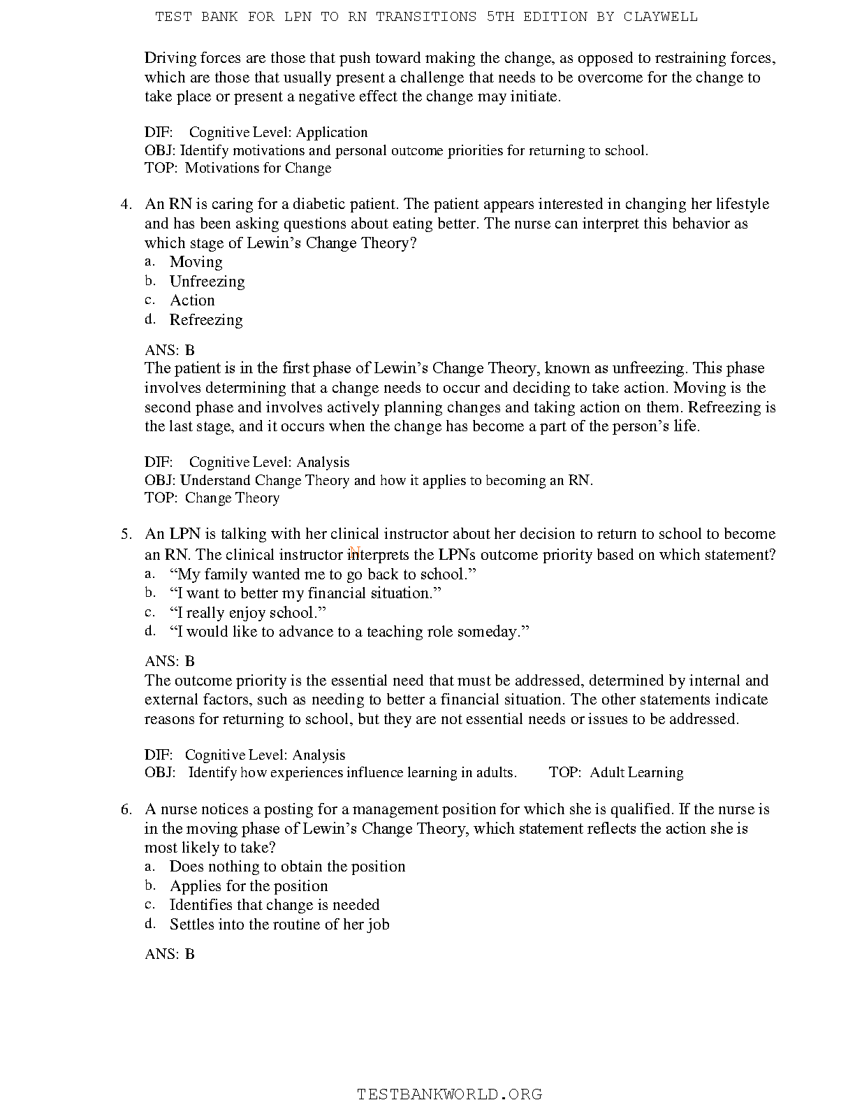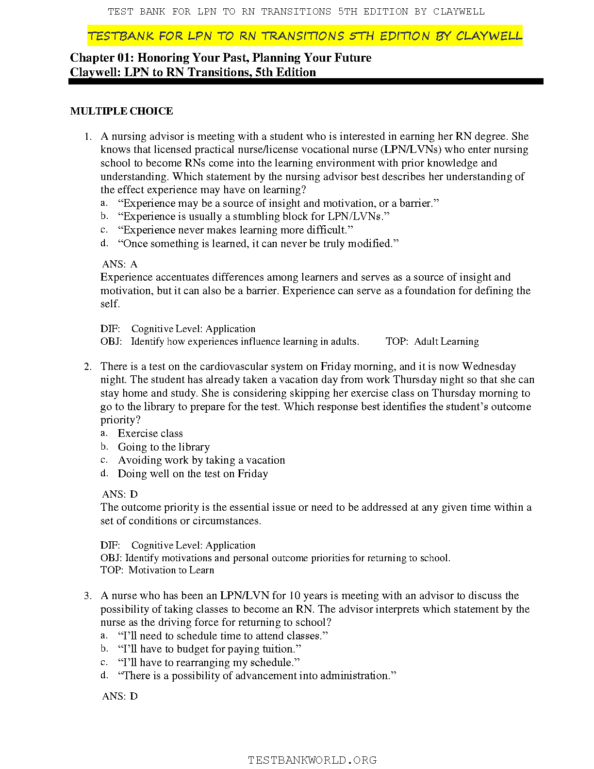 Ace your LPN to RN Transition course with this comprehensive test bank for the 5th Edition by Claywell. Get access to hundreds of practice questions, including explanations for each answer, ensuring you understand the concepts thoroughly. This resource is designed to help you achieve a high score on your exams and master the material for a successful transition.