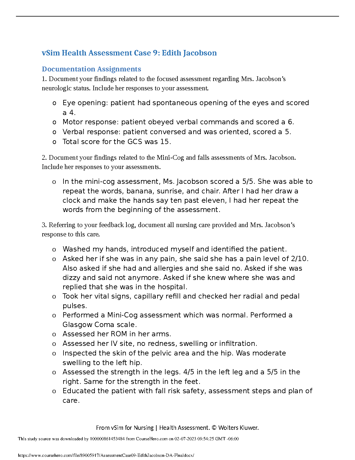 This resource contains a complete health assessment for a patient named Edith Jacobson, covering various aspects like neurological status, Mini-Cog assessment, falls assessment, and nursing care provided. It's ideal for nursing students, offering a realistic simulation experience to prepare for the NCLEX exam, helping them avoid resits.