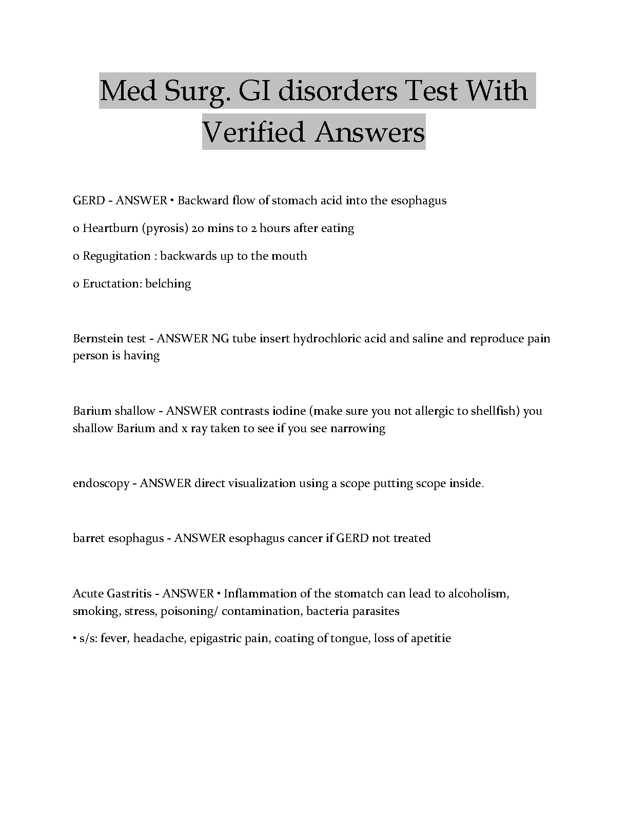 Med Surg GI Disorders Test With Verified Answers: Ace Your Exams With Confidence