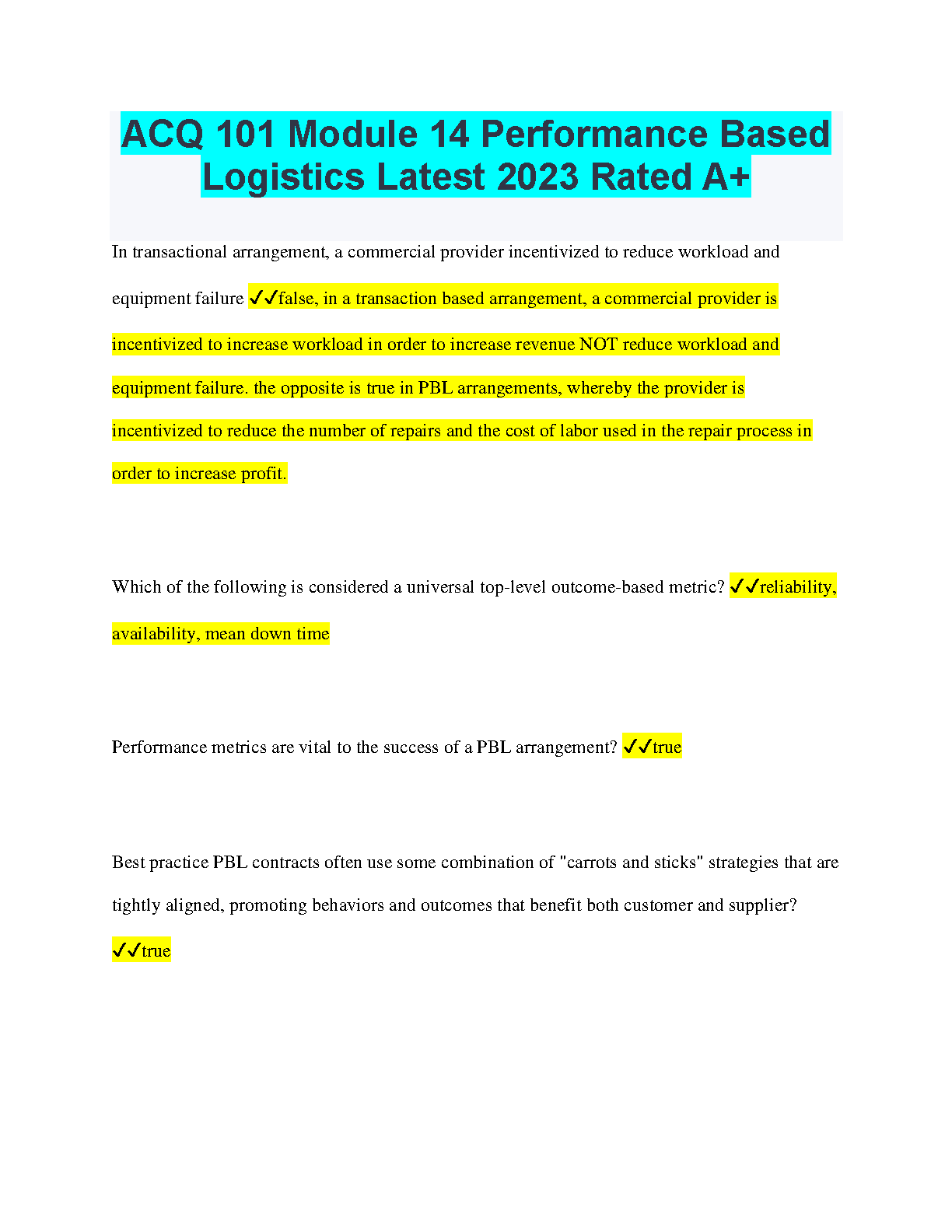ACQ 101 Module 14 Performance Based Logistics Latest 2023 Rated A+ - Get Exam Ready for Success on First Attempt!