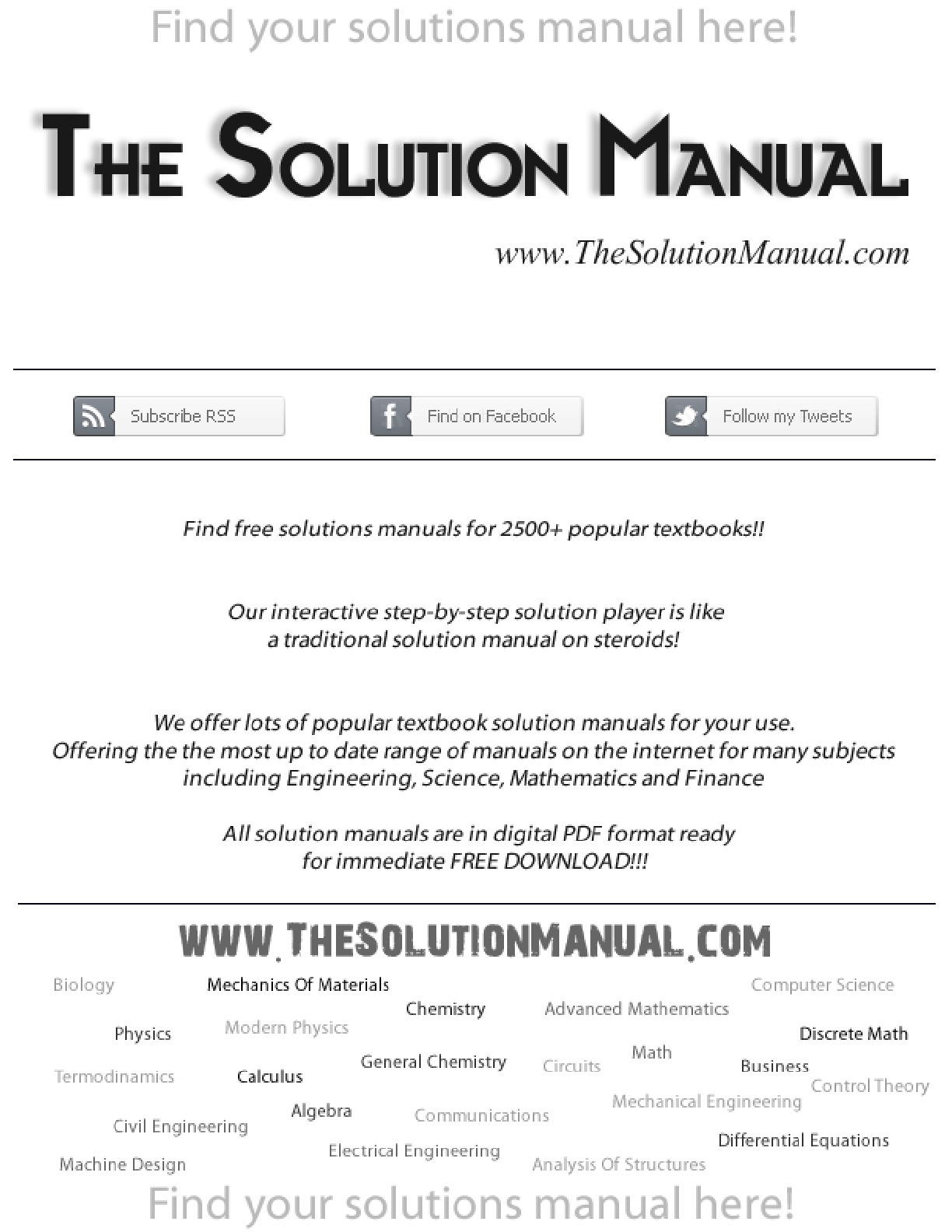 Download free solutions manuals for over 2500+ popular textbooks in various subjects like Engineering, Science, Mathematics, and Finance. Get instant access to detailed step-by-step solutions in PDF format, making studying easier and exam preparation a breeze.