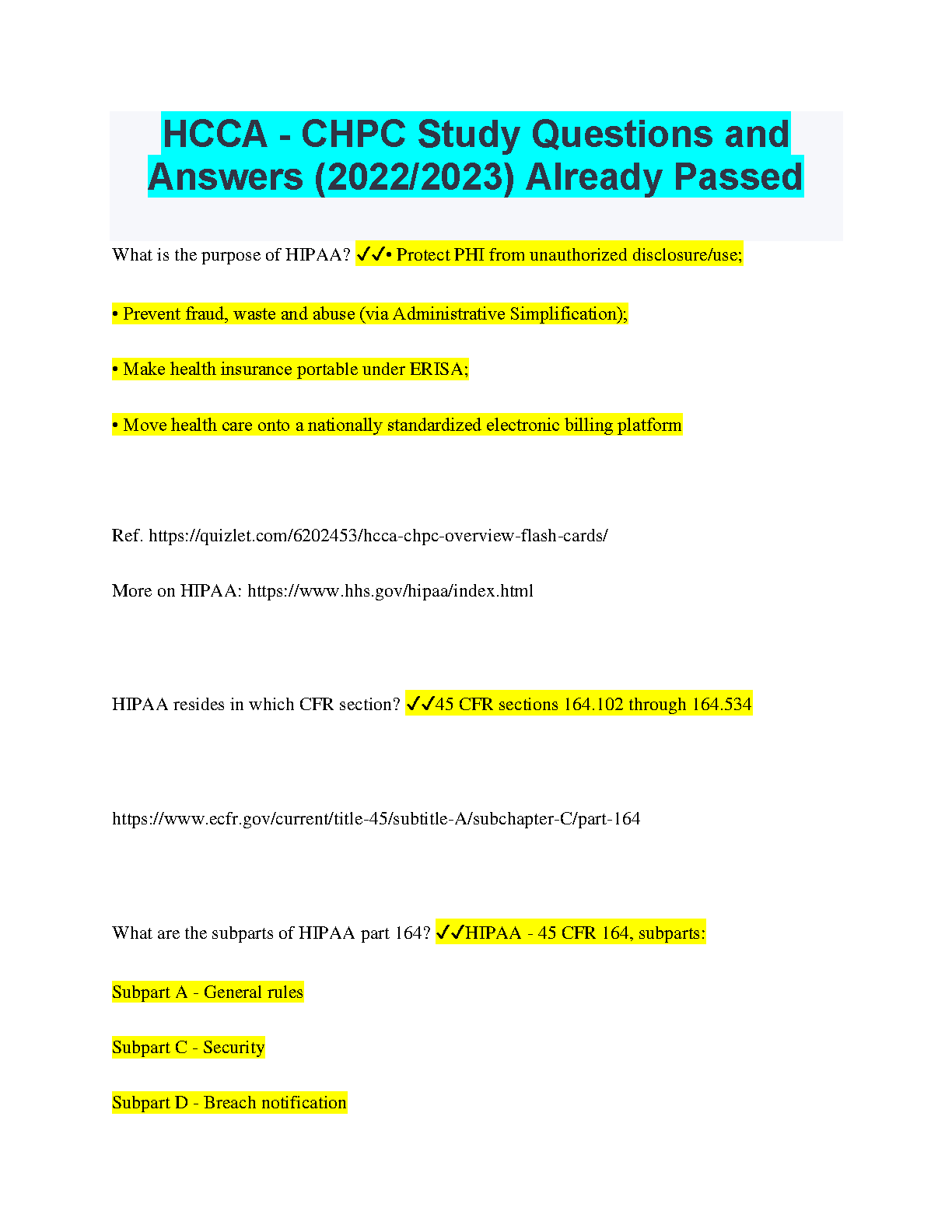 HCCA - CHPC Study Questions and Answers (2022/2023) - Already Passed for the 2024/2025 Academic Year