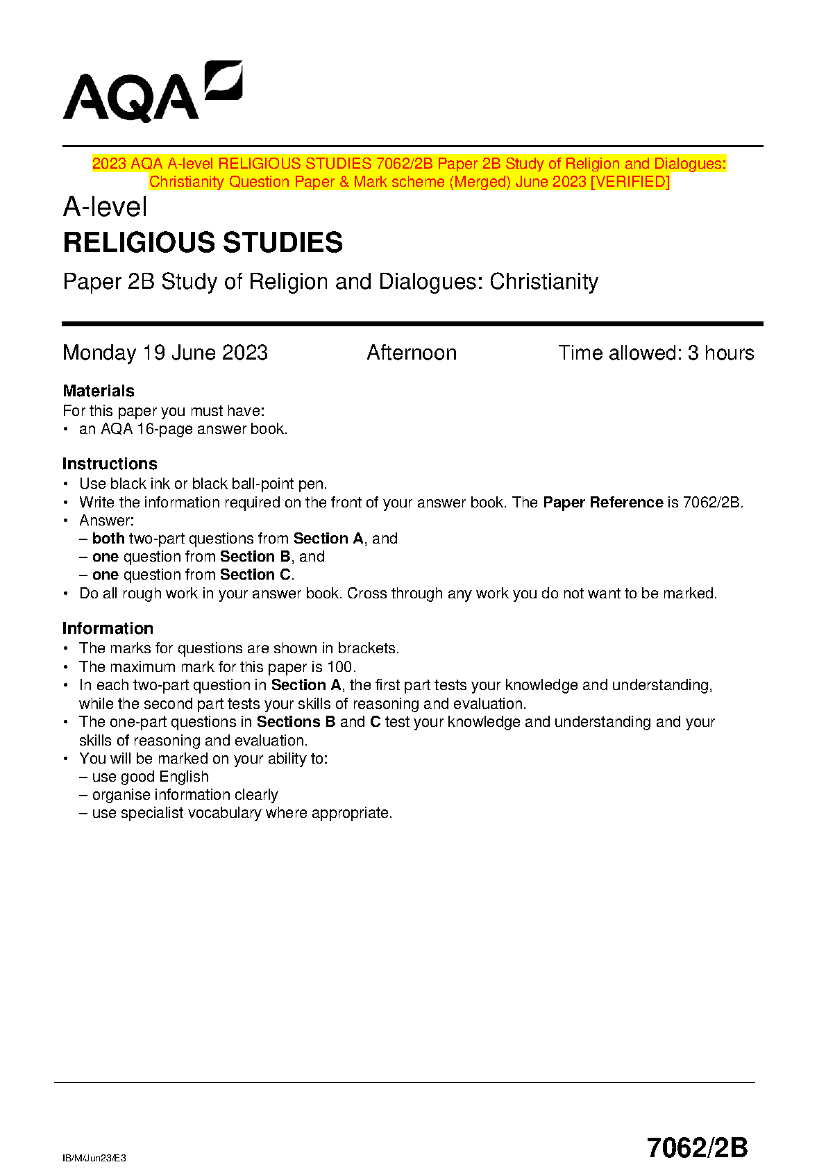 This is a complete and verified AQA A-Level Religious Studies 7062/2B Paper 2B Study of Religion and Dialogues: Christianity Question Paper & Mark Scheme (Merged) June 2023 Edition, specifically designed for students preparing for the June 2023 exam. This resource offers the most up-to-date question papers and mark schemes, providing students with invaluable practice and insights into the exam format and content.