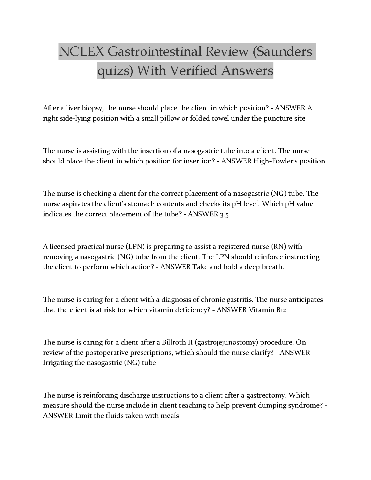 NCLEX-RN Gastrointestinal Review (Saunders) with Verified Answers - 2024/2025 Edition - Pass Your Exam on the First Attempt - By Linda Anne Silvestri, Terri Ann Hoekelman