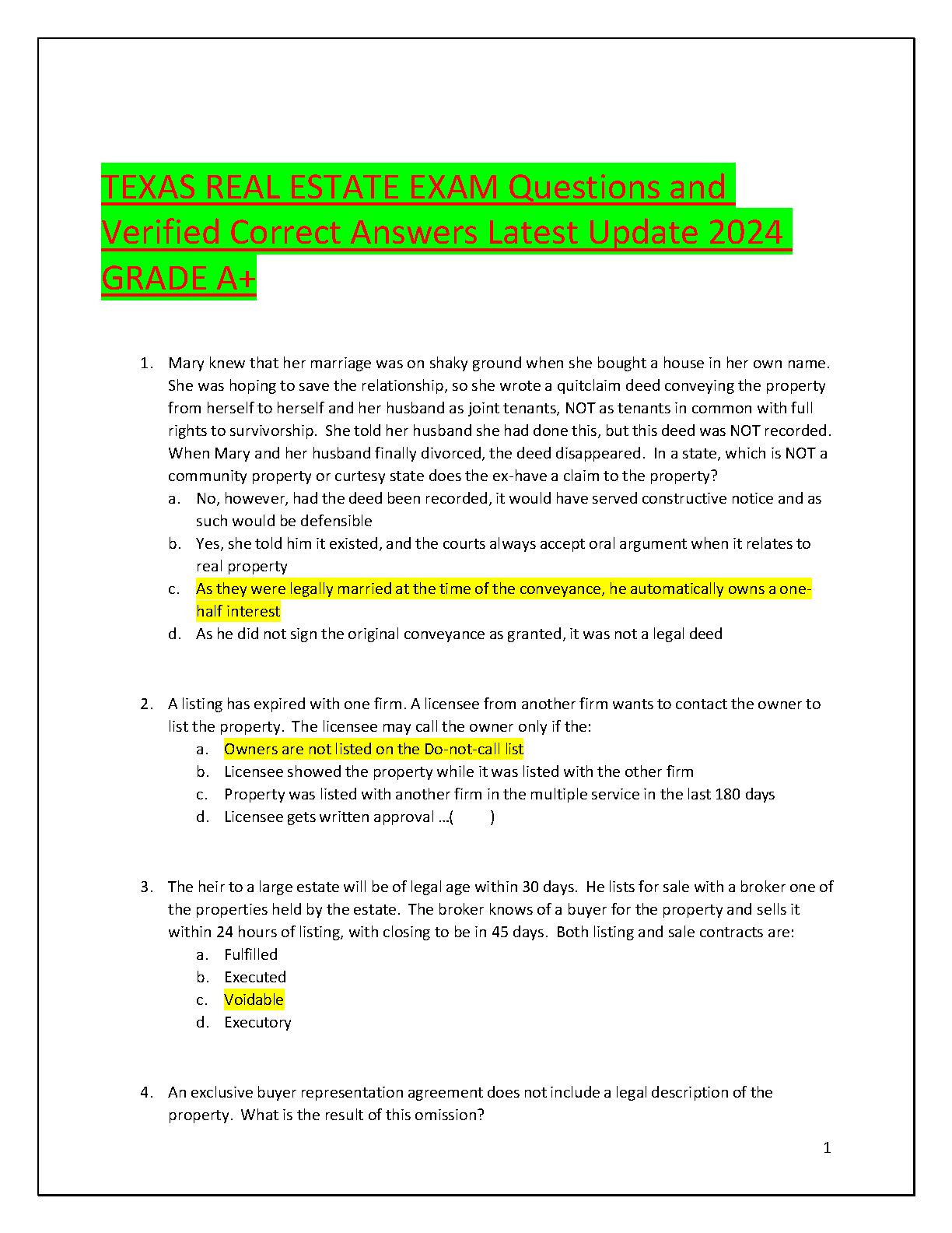 Texas Real Estate Exam Questions and Answers Latest Update 2024 - Grade A+