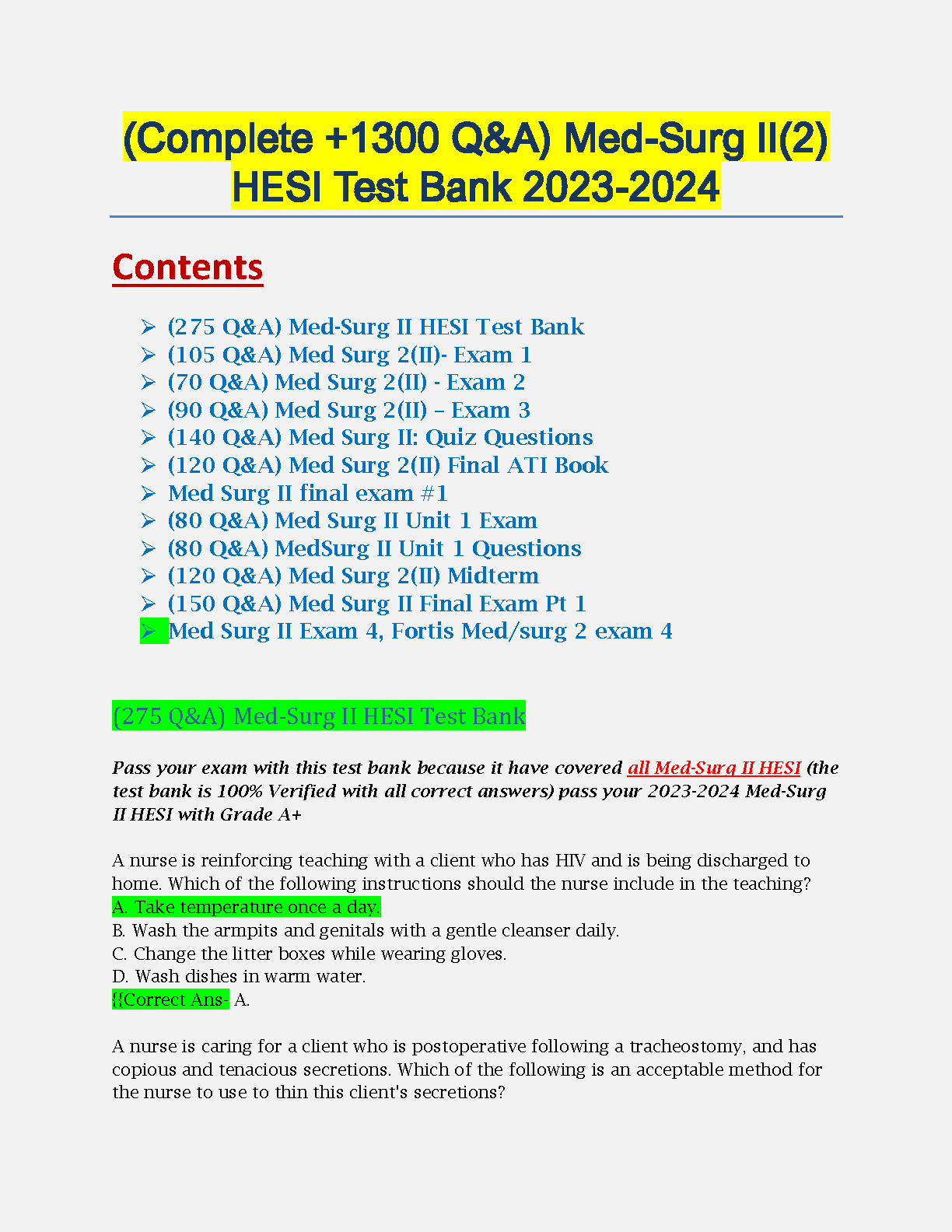 HESI Med-Surg II (2) Test Bank 2023-2024 - 1300 Q&A - Complete Edition