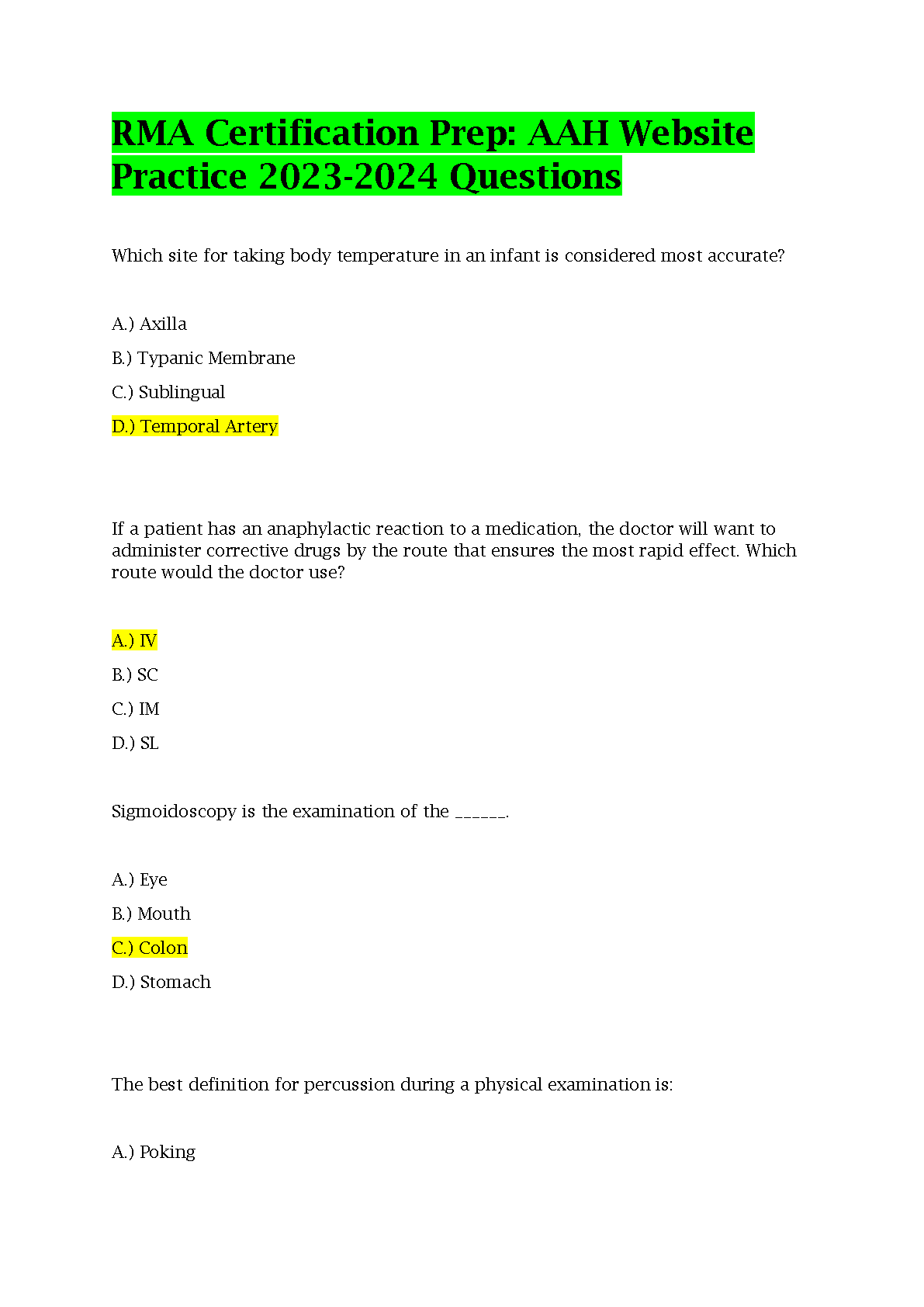 RMA Certification Prep: AAH Website Practice 2023-2024 Questions