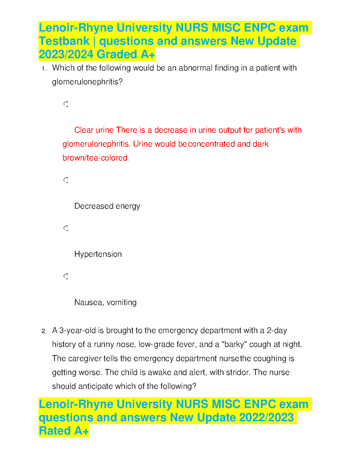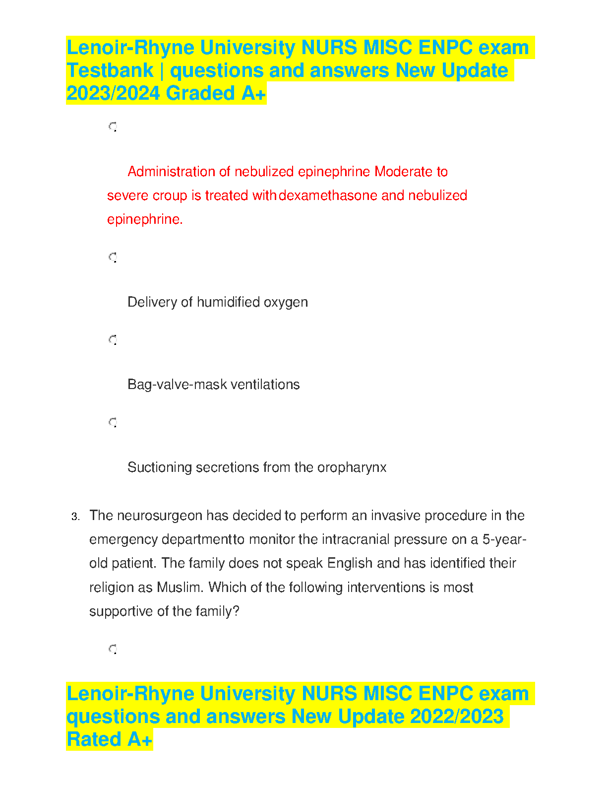 Lenoir-Rhyne University NURS MISC ENPC Exam Testbank Questions and Answers New Update 2023/2024 Graded A+