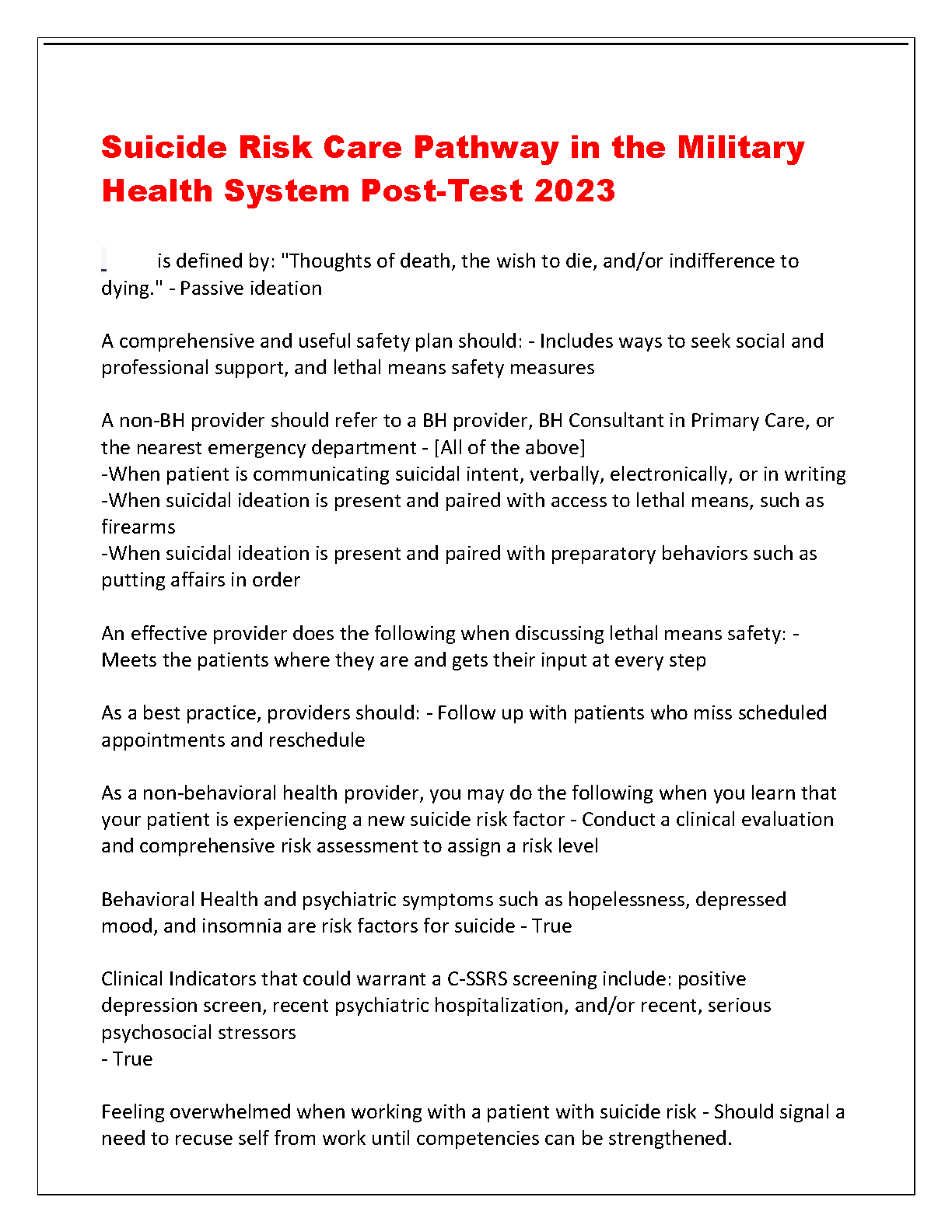 This comprehensive guide covers all aspects of suicide risk care pathway in the military health system, providing detailed information and insights to help students pass their exams on the first attempt. This post-test is designed to help students achieve a deep understanding of the subject, covering crucial topics like suicide risk factors, assessment, and intervention strategies. The guide includes real-world examples and practical tips to aid in the learning process.