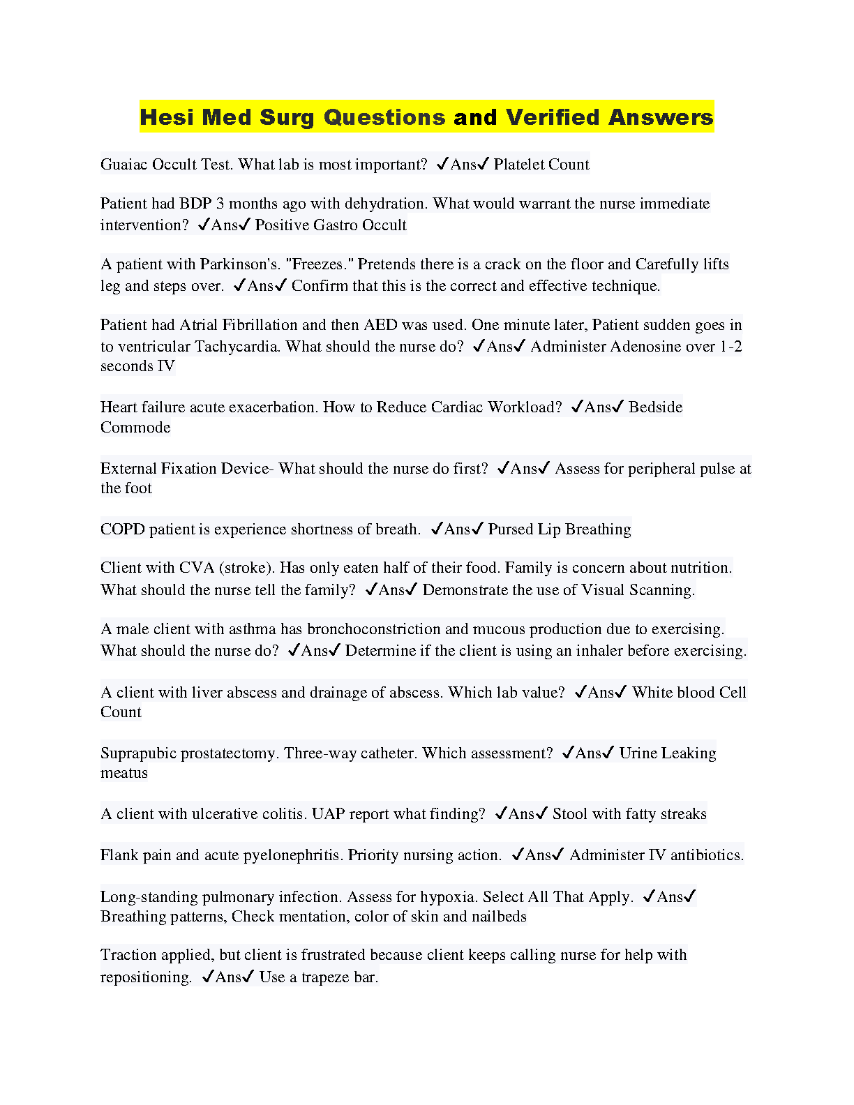 HESI Med Surg Questions and Verified Answers for 2024/2025: Ace Your Exams on the First Attempt and Avoid Resits