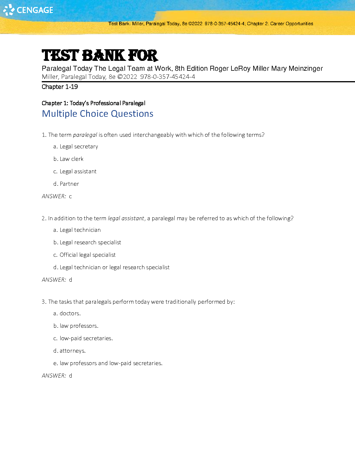 This comprehensive Test Bank for Paralegal Today: The Legal Team at Work, 8th Edition by Roger LeRoy Miller and Mary Meinzinger provides instructors with a valuable resource to assess student understanding of the material. It includes a variety of multiple-choice questions, true/false questions, and essay questions that cover all key concepts and topics discussed in the textbook.