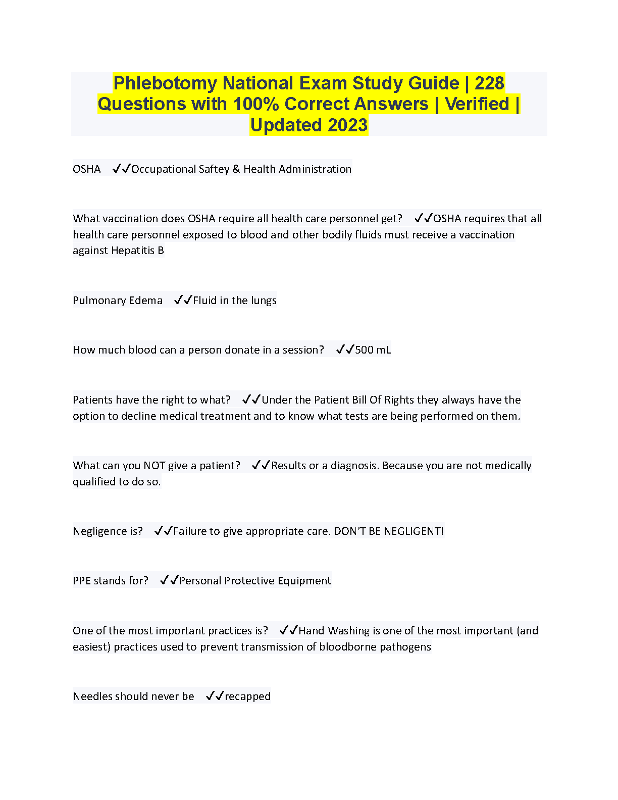 Get ready to ace your Phlebotomy National Exam with this comprehensive study guide! Inside, you'll find 228 practice questions, 100% verified answers, and updated content for 2024/2025, making it the perfect resource to pass your exam on the first attempt.