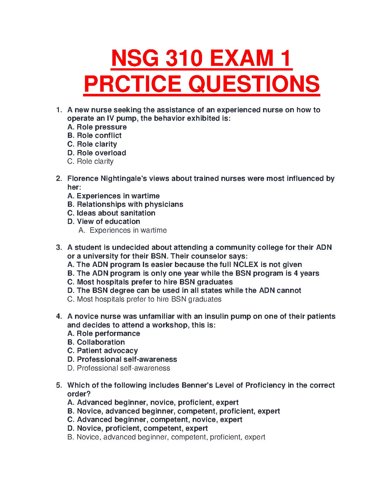 NSG 310 EXAM 1 PRCTICE QUESTIONS AND CORRECT ANSWERS 2023