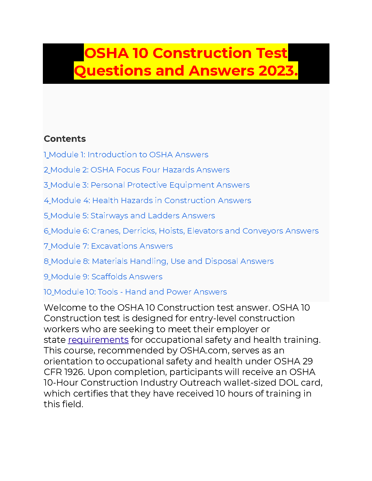Ace your OSHA 10 Construction Test with this comprehensive study guide! Our expertly curated answers will help you understand the key concepts and pass with confidence, making your first attempt a success.