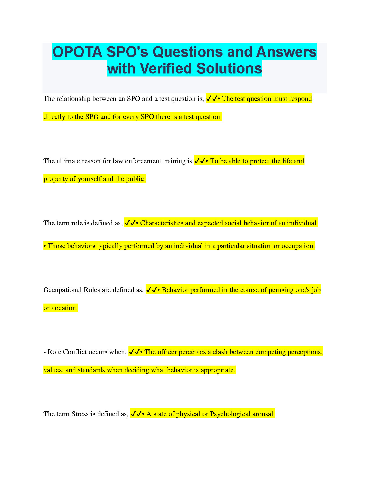 This is a compilation of OPOTA SPO's questions and answers with verified solutions. This resource will help you ace your exams on the first attempt, avoiding the need for resits.