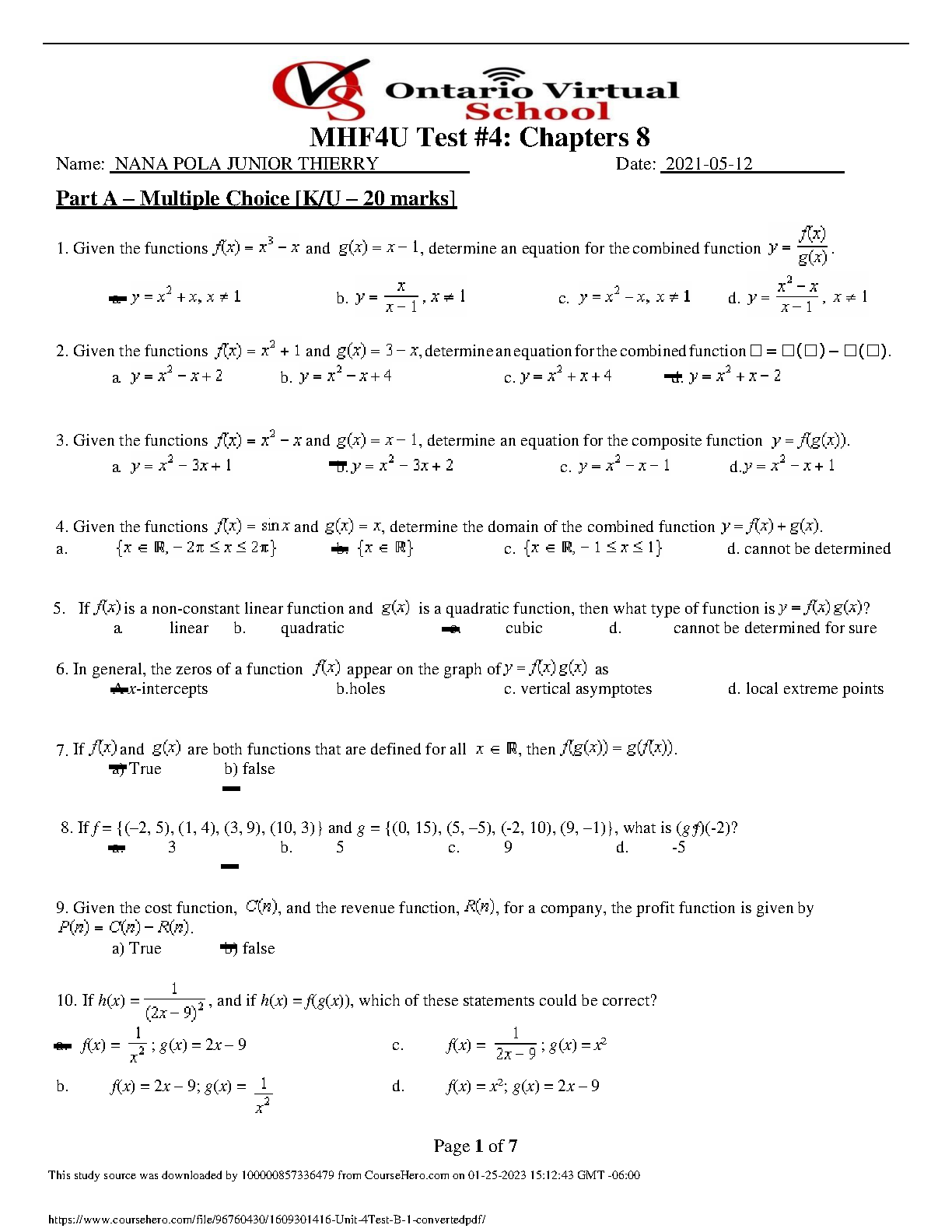 MHF4U Test #4: Chapters 8 - Functions and Transformations, Edition 2021-05-12 by Ontario Virtual School