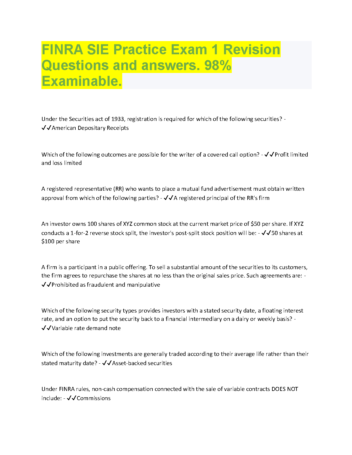 FINRA SIE Practice Exam 1 Revision Questions and Answers. 98% Examinable: 2024/2025 Edition, by [Author Name]
