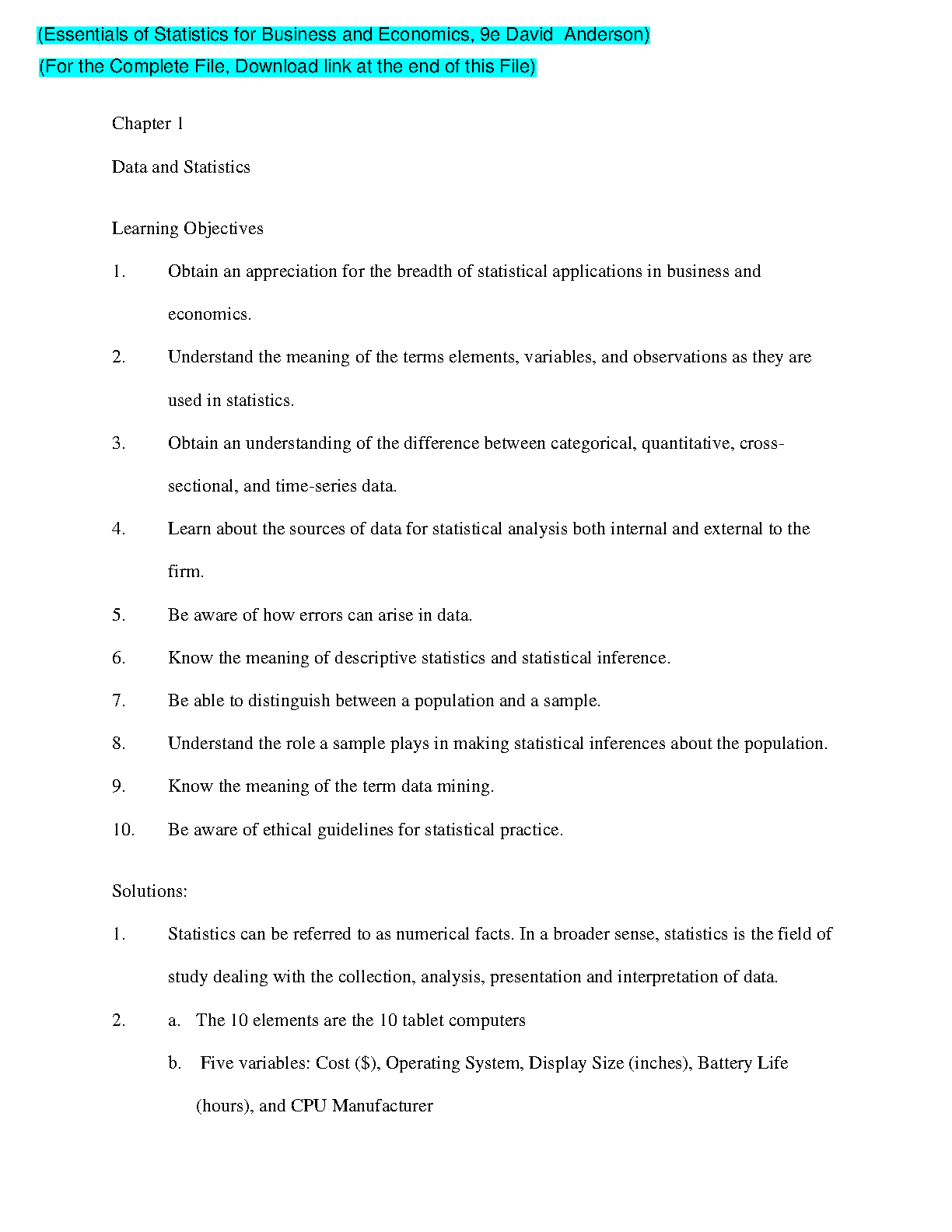 Essentials of Statistics for Business and Economics, 9e, David Anderson, Dennis Sweeney, Thomas Williams, James Schaefer