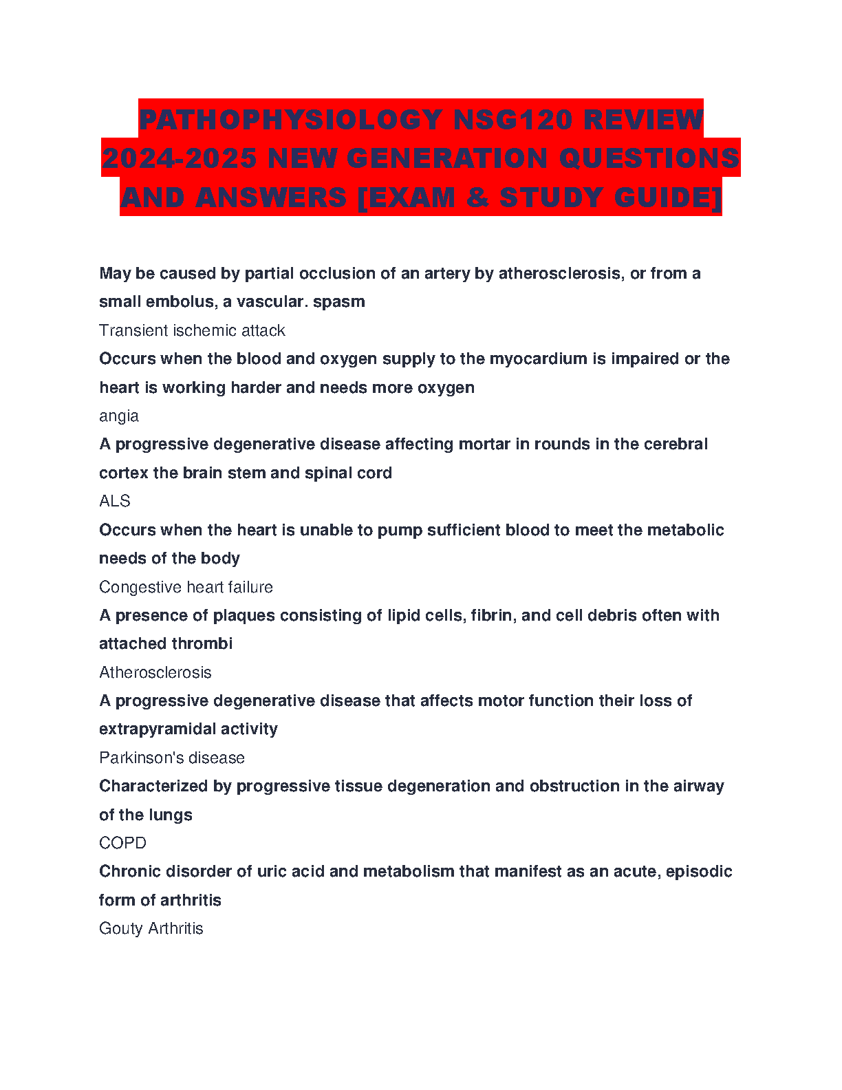 PATHOPHYSIOLOGY NSG120 REVIEW 2024-2025 NEW GENERATION QUESTIONS AND ANSWERS [EXAM & STUDY GUIDE]