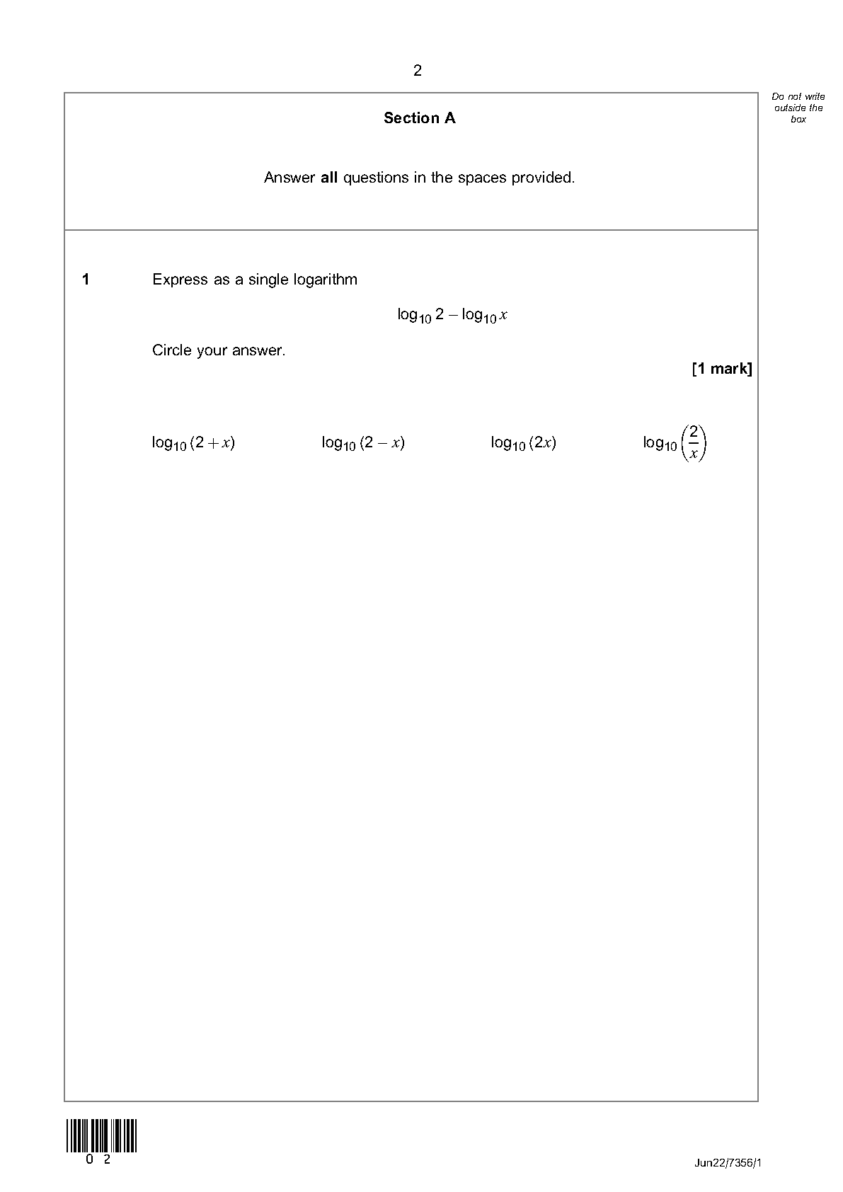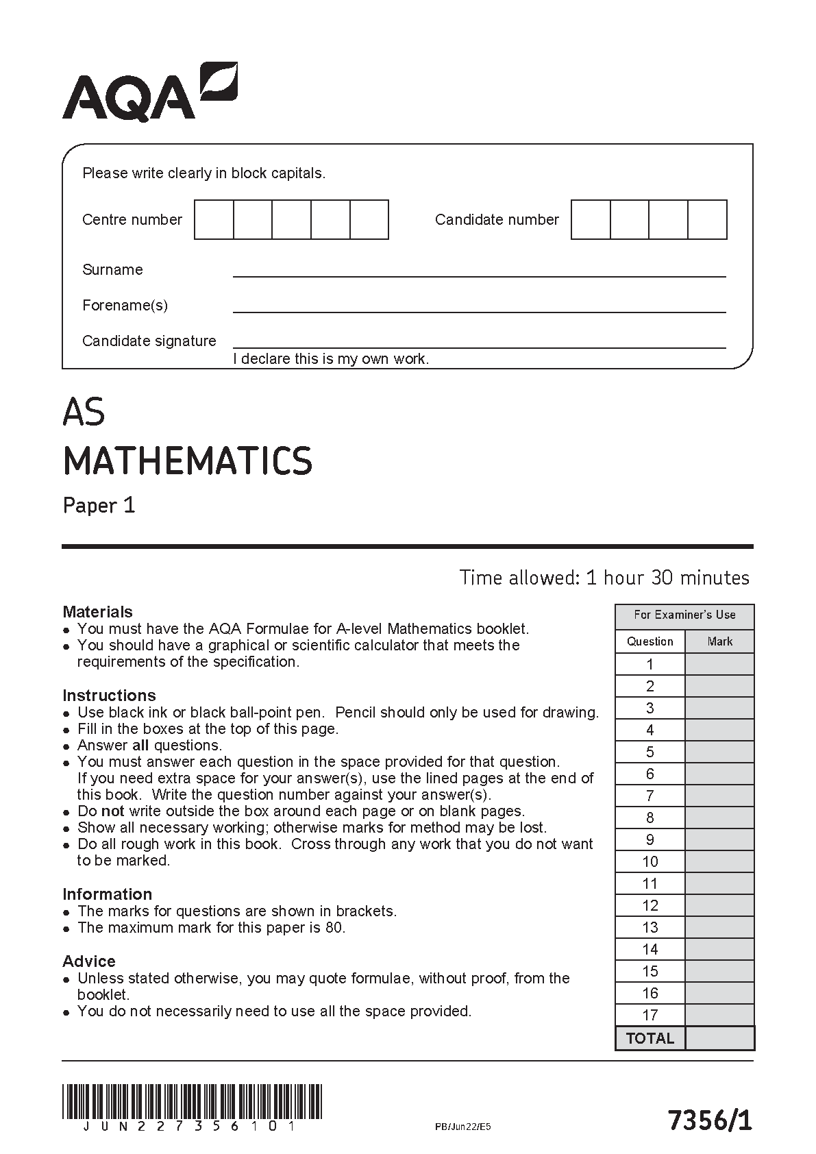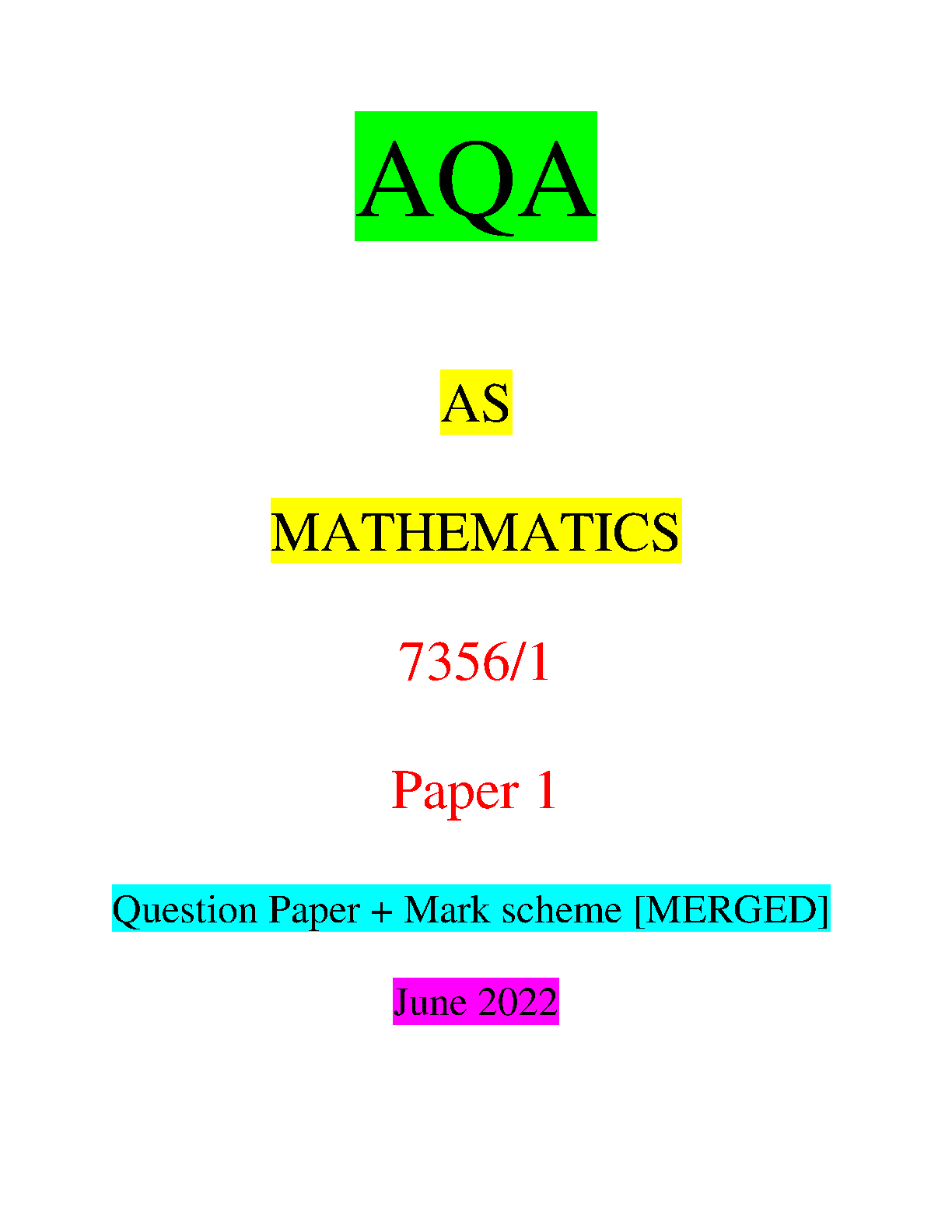 AQA AS Level Mathematics 7356/1 June 2022 Paper 1 Question Paper and Mark Scheme