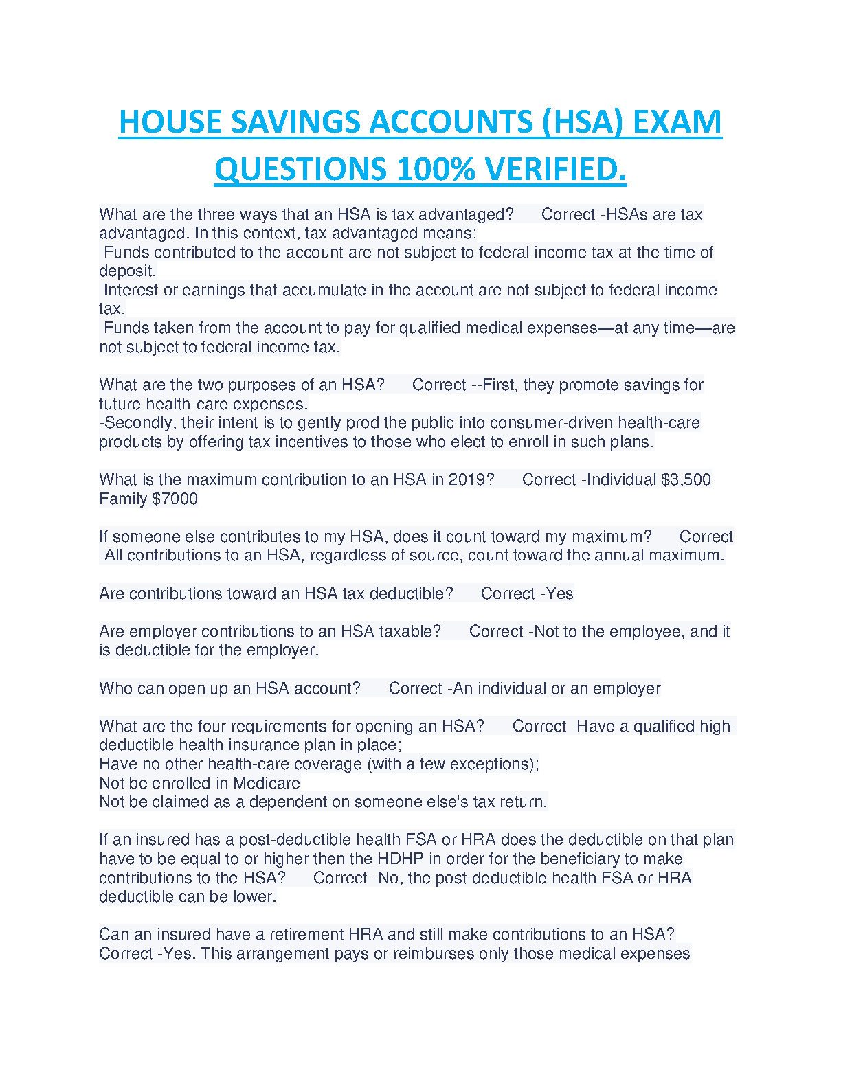 House Savings Accounts (HSA) Exam Questions 100% Verified - 2024/2025 Edition: Ace your Exams and Avoid Resits with Proven Practice Materials