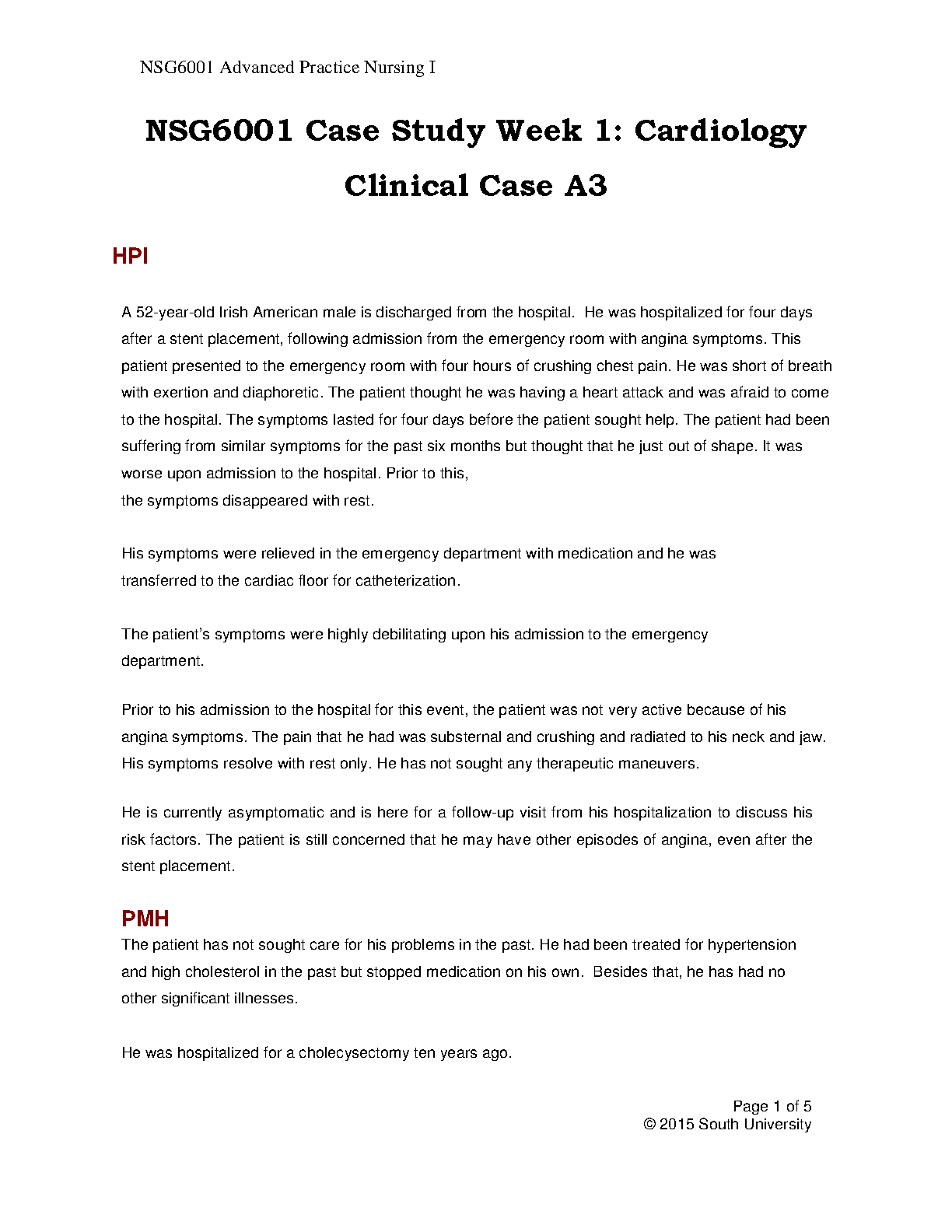 NSG6001 Advanced Practice Nursing South University Case Study Week 1: Cardiology Clinical Case A3. LATEST UPDATED VERSION 2023!!!