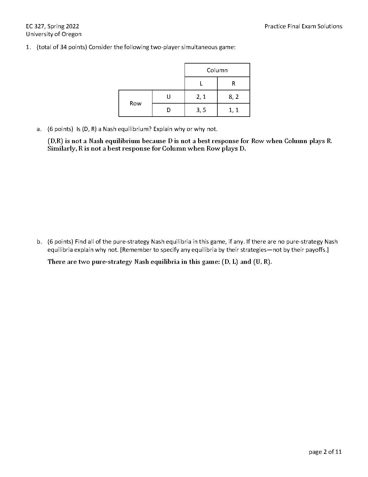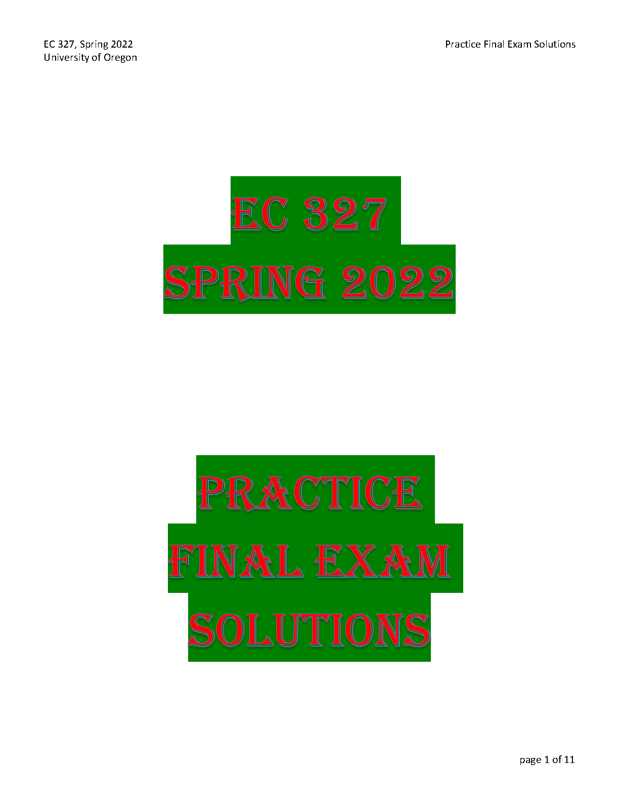 EC 327 Spring 2022 Practice Final Exam Solutions - University of Oregon