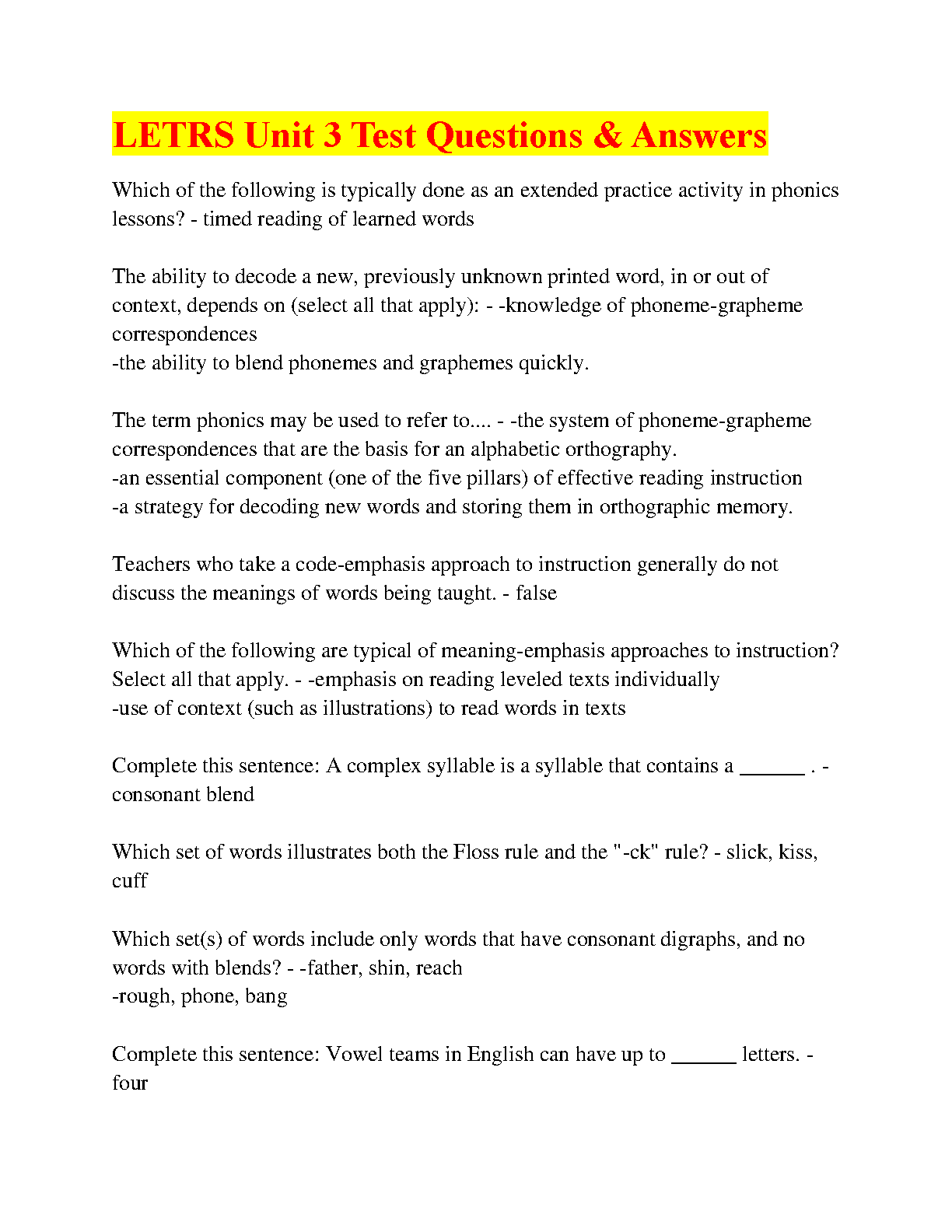 Ace your LETRS Unit 3 exam with these comprehensive test questions and answers! This resource is tailored for the 2024/2025 academic year, ensuring you're equipped with the most up-to-date information. Master phonics concepts, decoding strategies, and more to achieve a top score on your first attempt.
